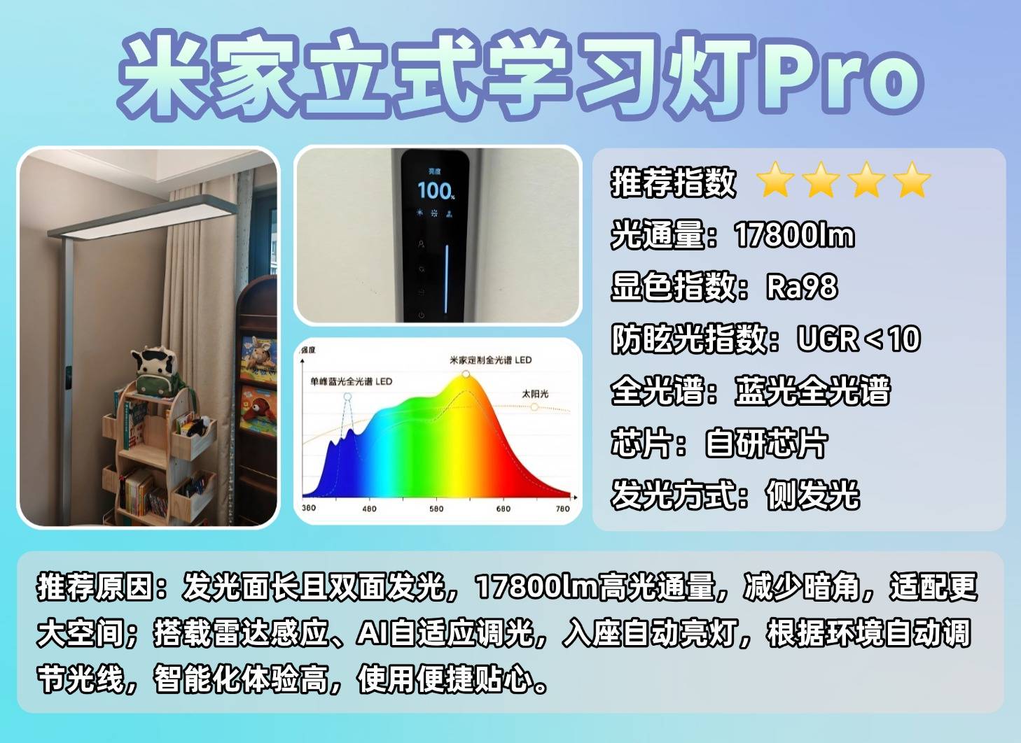 台灯落地灯最好的品牌有哪些?米家立式学习灯Pro主打大空间照明,20-25㎡的开放式客厅学习区、多孩家庭的大书房都能适配。17800lm高光通量通过侧发光技术释放,上光源光通量为下光源5倍,不过上光源亮度太高,近距离直视或天花板反光较强时可能产生晃眼感。核心护眼性能上,UGR<10的防眩光指数,正常坐姿下直视灯头无刺眼感;蓝光全光谱配合Ra98显色指数,物体色彩比较接近自然光。