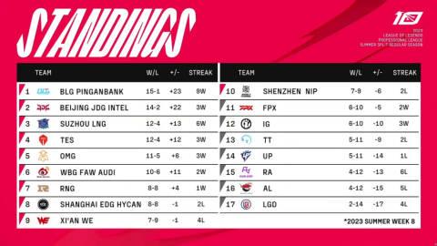 今日赛果、积分排行及季后赛赛程: RNG 2-0 LGD WBG 2-0 EDG AL 0-2 OMG 没有意外的三场比赛,宣告了2023夏季赛常规赛正式结束!!! 季后赛第一轮,EDG打RNG,WE打NIP。 谁能进入下一轮呢?