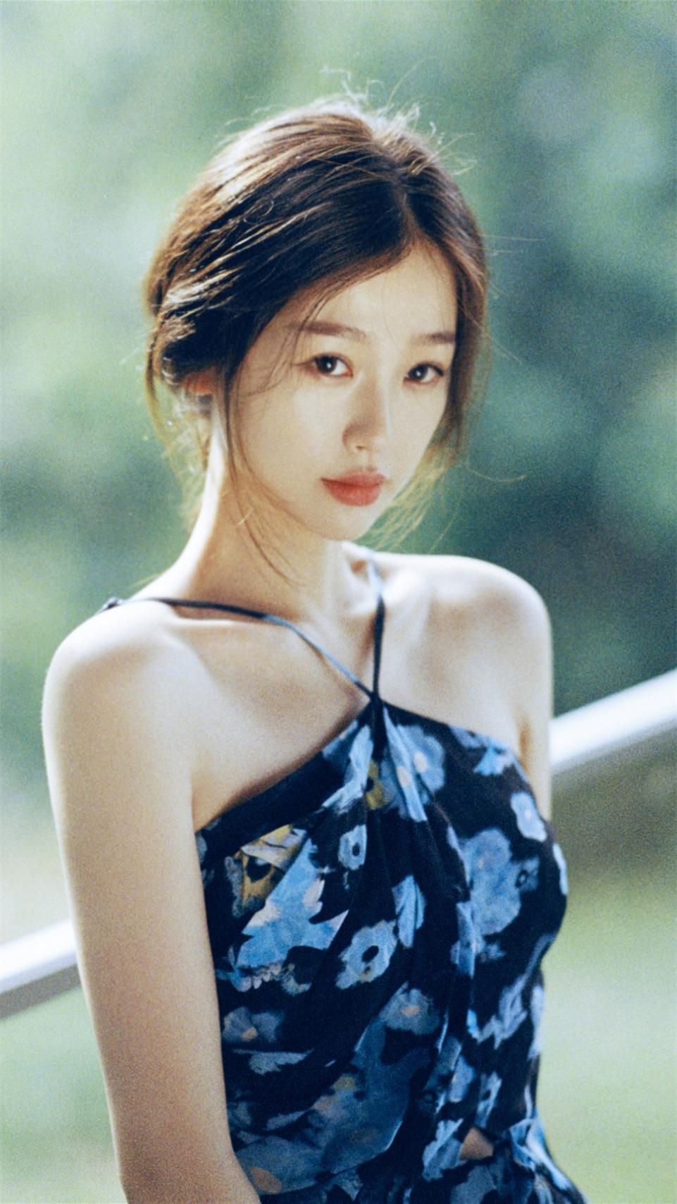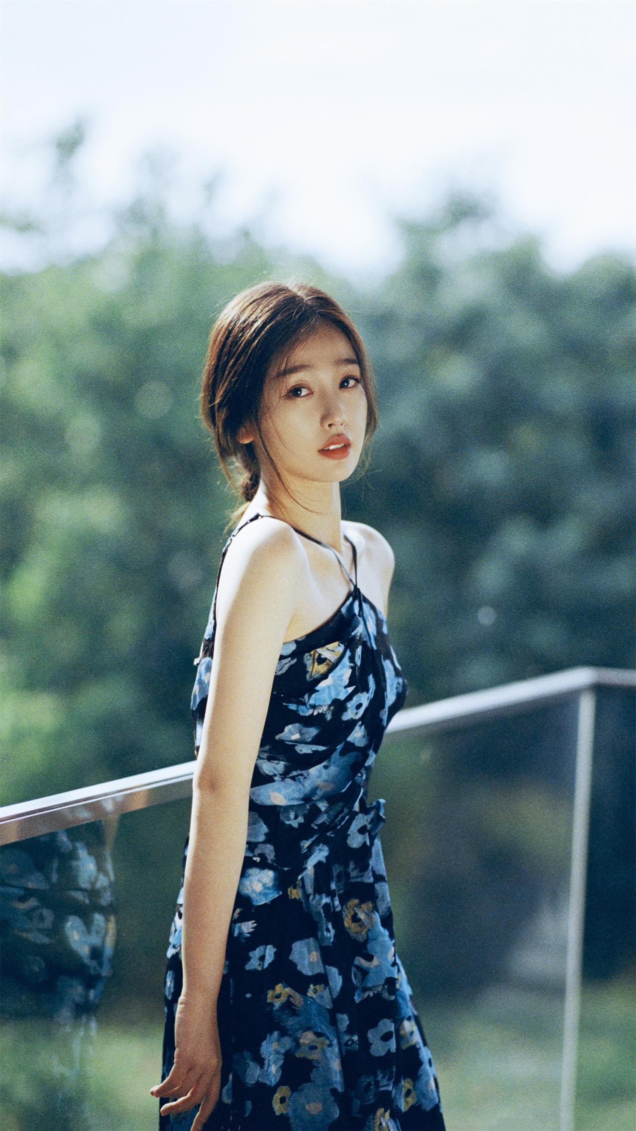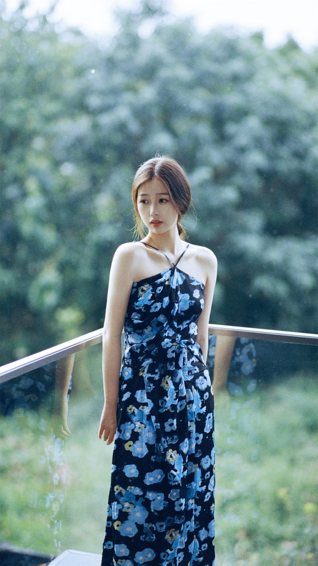 虞书欣手机壁纸,蓝色印花挂脖裙搭配单边麻花辫随拍美照