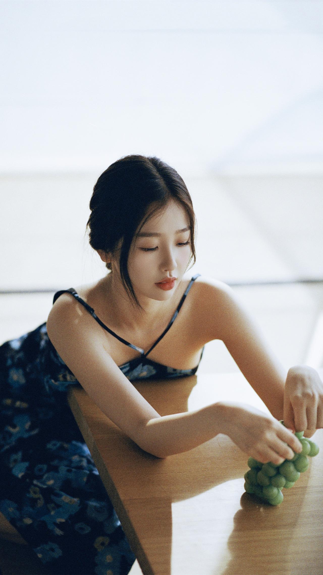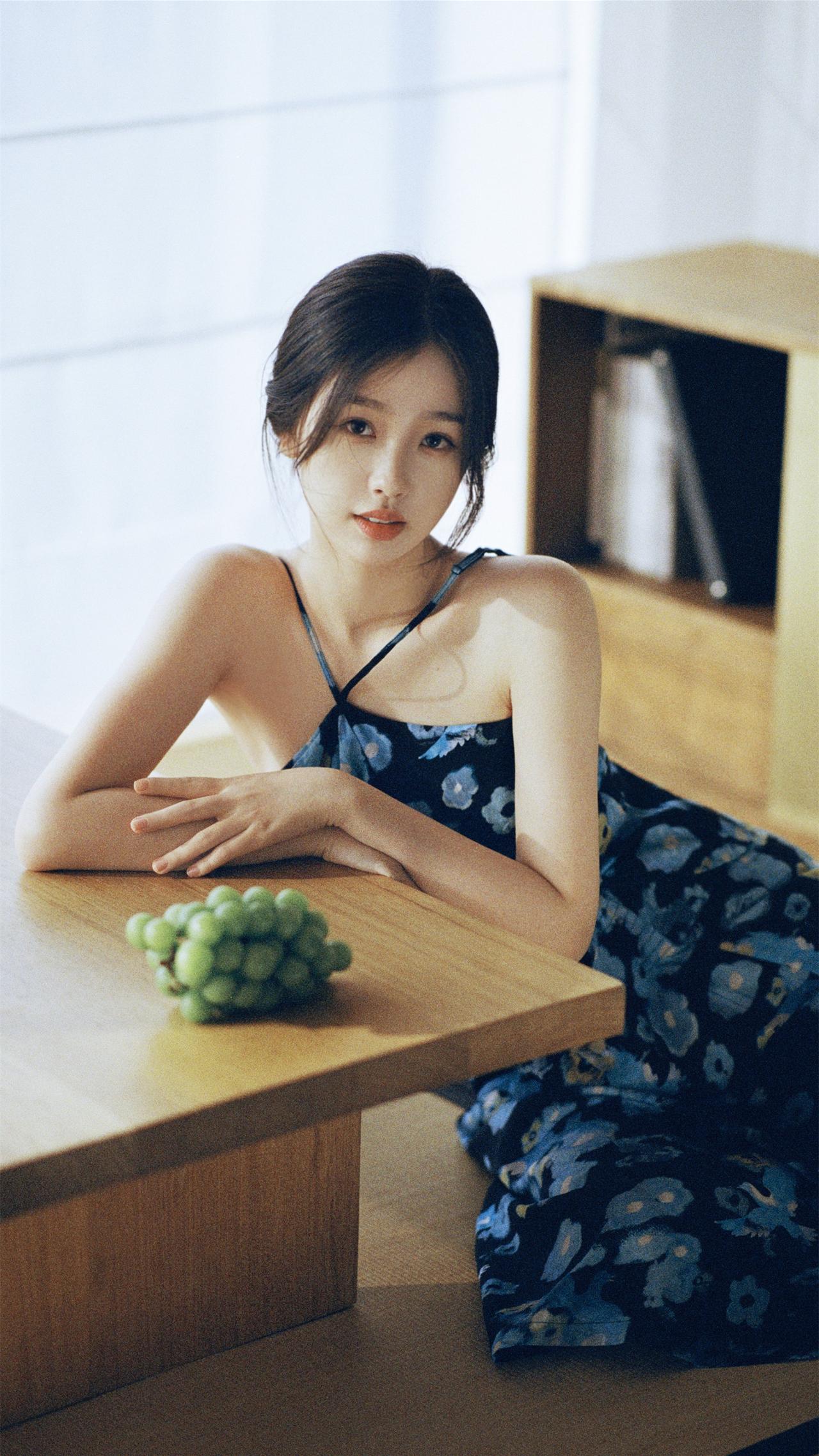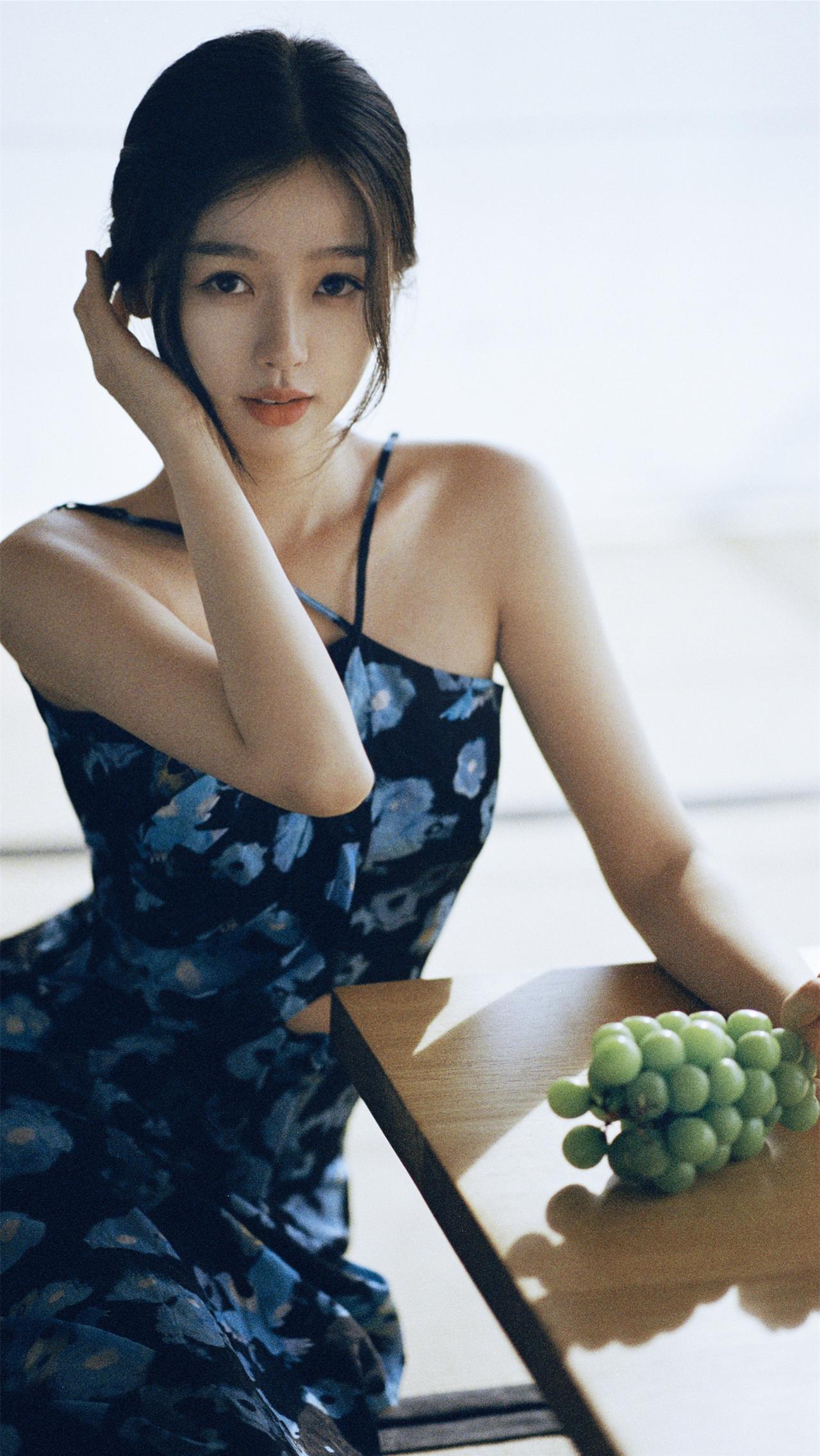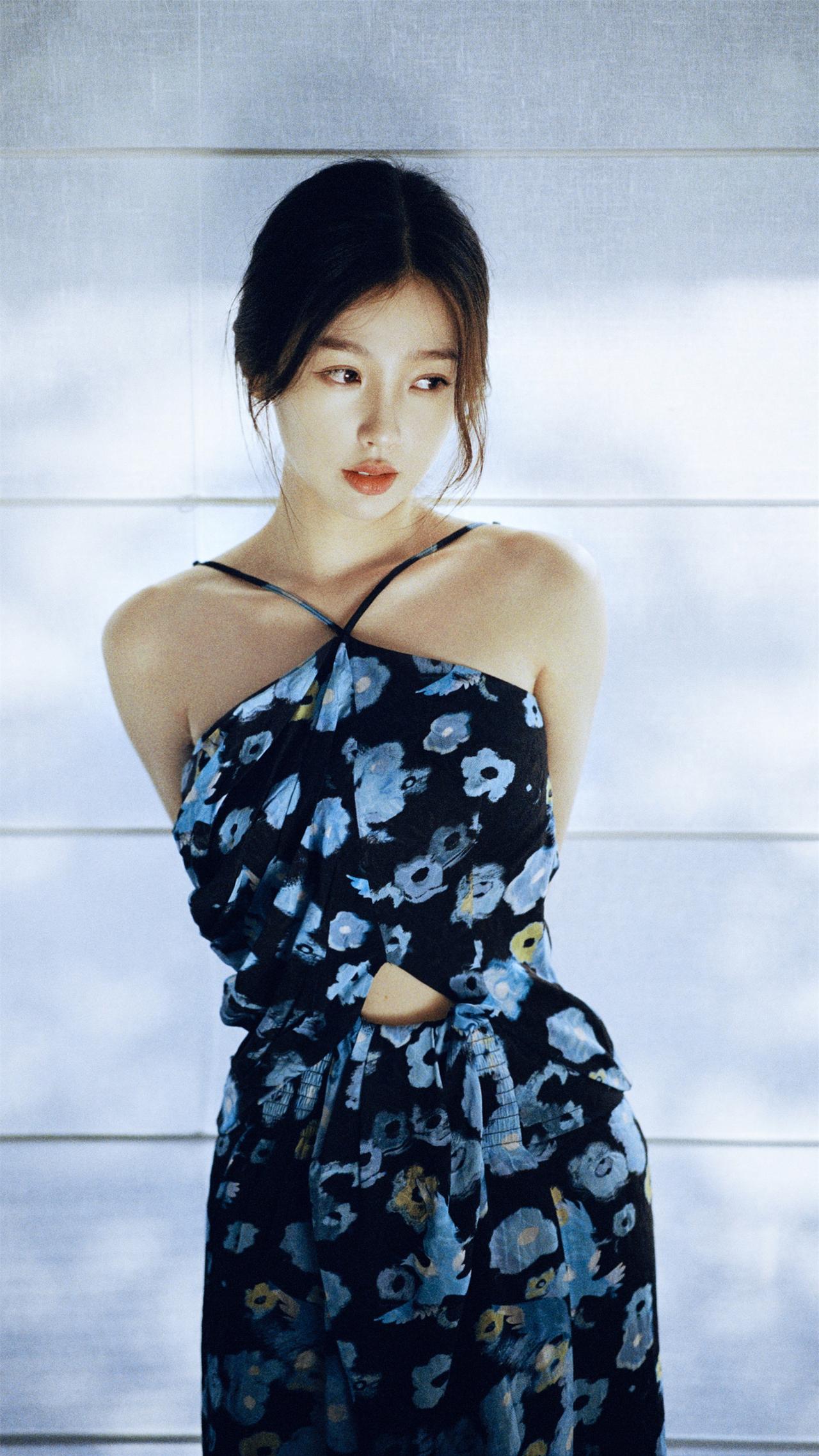 虞书欣手机壁纸,蓝色印花挂脖裙搭配单边麻花辫随拍美照