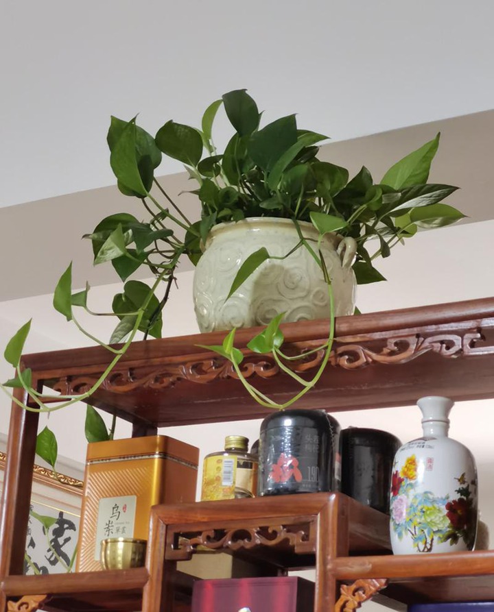 从视觉效果上看,绿萝完全覆盖的盆栽给人一种强烈的冲击感。这种绿意扑面而来,让人仿佛置身于热带雨林的边缘。它在整个空间中占据着主导地位,成为了视觉的焦点。在繁忙的生活和工作中,当我们偶尔抬头看到这一片繁茂的绿萝时,内心会不由自主地感到平静和放松。它就像一个绿色的守护者,默默地净化着室内的空气,同时给人带来美的享受。
