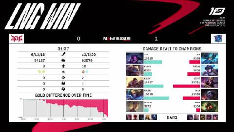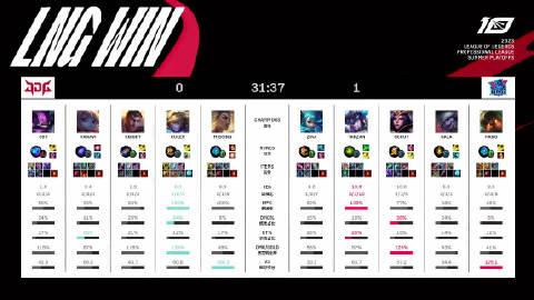 【JDG vs LNG 第一局】 MVP:Scout(乐芙兰) 第一次看到在蓝色方被暴打的,主要是没见过蓝色方的BP选EZ凯南和波比打野的。