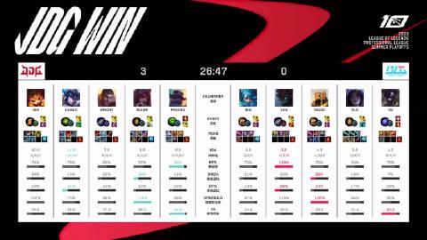2023LPL夏季赛季后赛胜者组决赛【BLG vs JDG第三局比赛】 MVP:369(纳尔) 仅仅今年,BLG已经输给JDG七次了,今天一场比一场快,比赛是五点开的,打完才七点半,恭喜JDG挺进夏决,并成为全球首个S13参赛队伍。