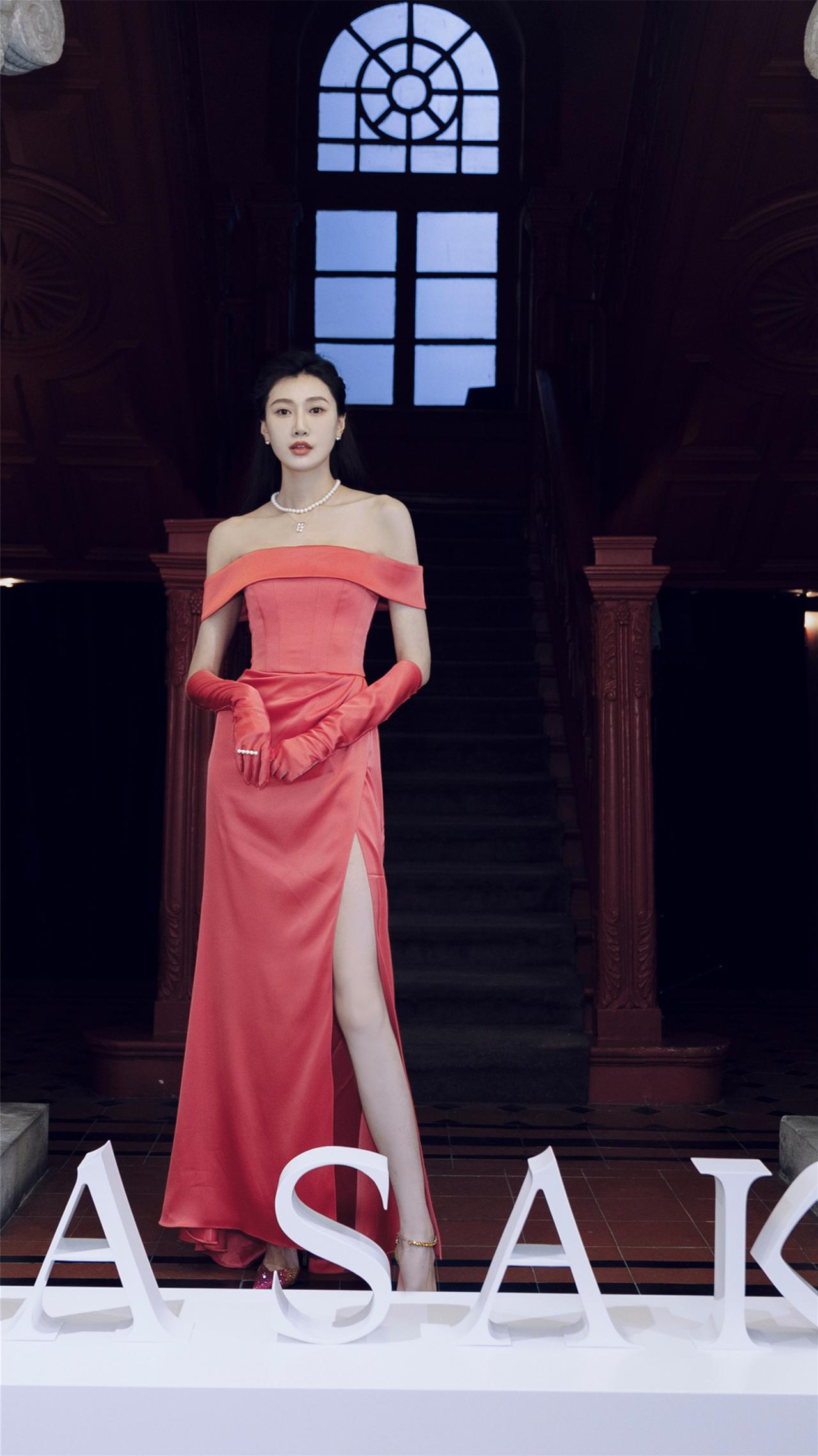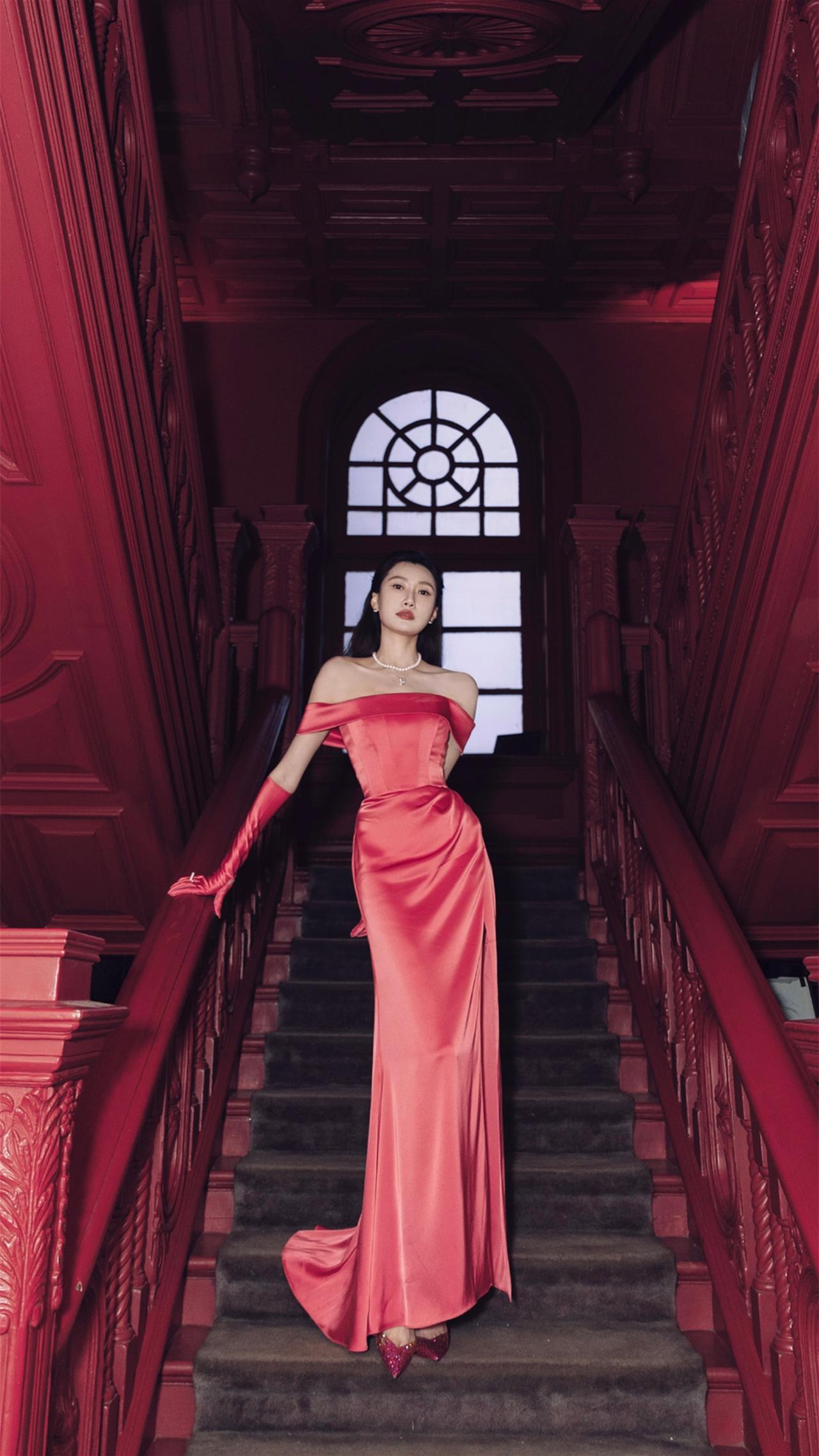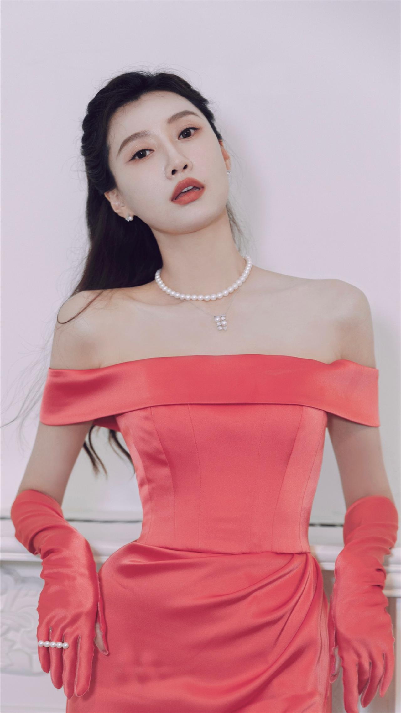 李斯羽粉红丝缎抹胸裙造型壁纸图集