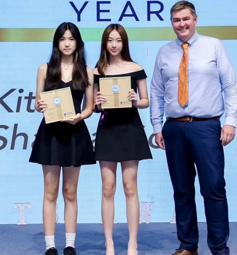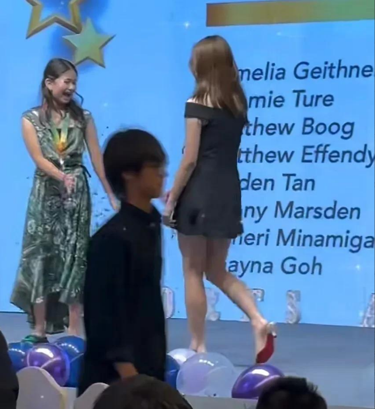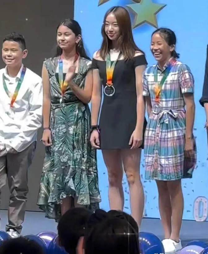 学校里的工作人员为孩子们颁奖,neinei 穿着黑色礼服,位置很居中,站在同学身边非常显眼,她本身个头就不矮,又穿了高跟鞋,14 岁就有很强的气场了。吴尊还分享了两张现场的精修图,孩子大了也知道爱美了,必须要展现女儿漂亮阳光的一面。