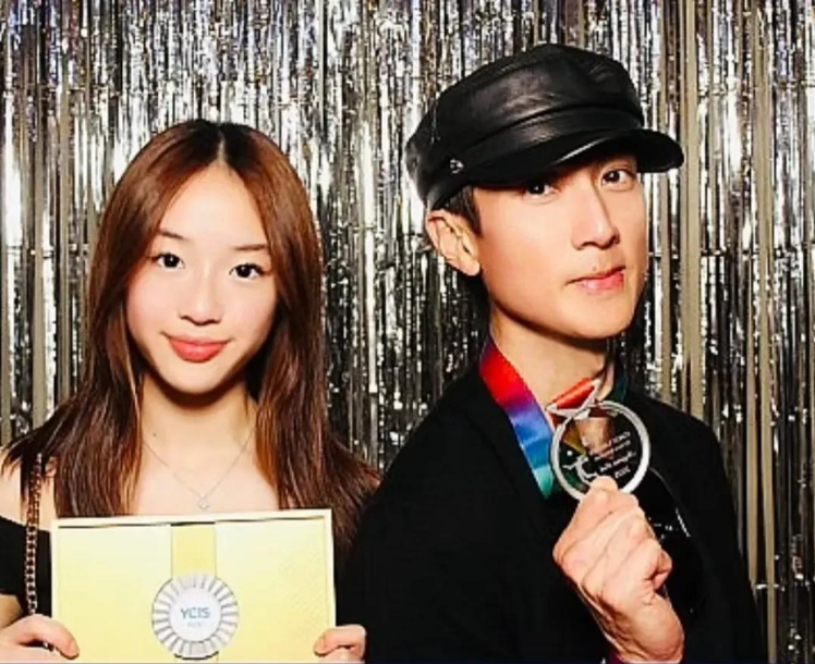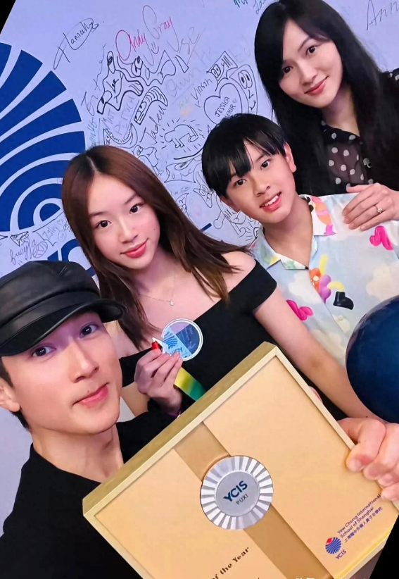 吴尊晒出参加女儿学校活动的照片,14 岁 neinei 通过自己的努力获得了两个奖项,全家到场一起庆祝,吴尊拿着女儿的奖牌开心自拍,弟弟 max 越长越像爸爸,林丽吟则稳重大方站在最后面,四口人颜值都好高,一家子都是明星脸。