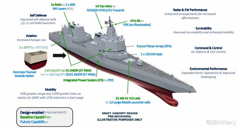 “阿利·伯克”Flight III型驱逐舰对美国海军未来的作战非常重要,配备了AN/SPY-6(V)1有源相控阵雷达,具备反导能力,并且升级了电力和冷却能力以及其他增强功能。 “阿利·伯克”Flight III型驱逐舰还将承担防空指挥舰任务,目前这些任务由美国海军老化的“提康德罗加”级巡洋舰承担,近年来一直在逐步退役。
