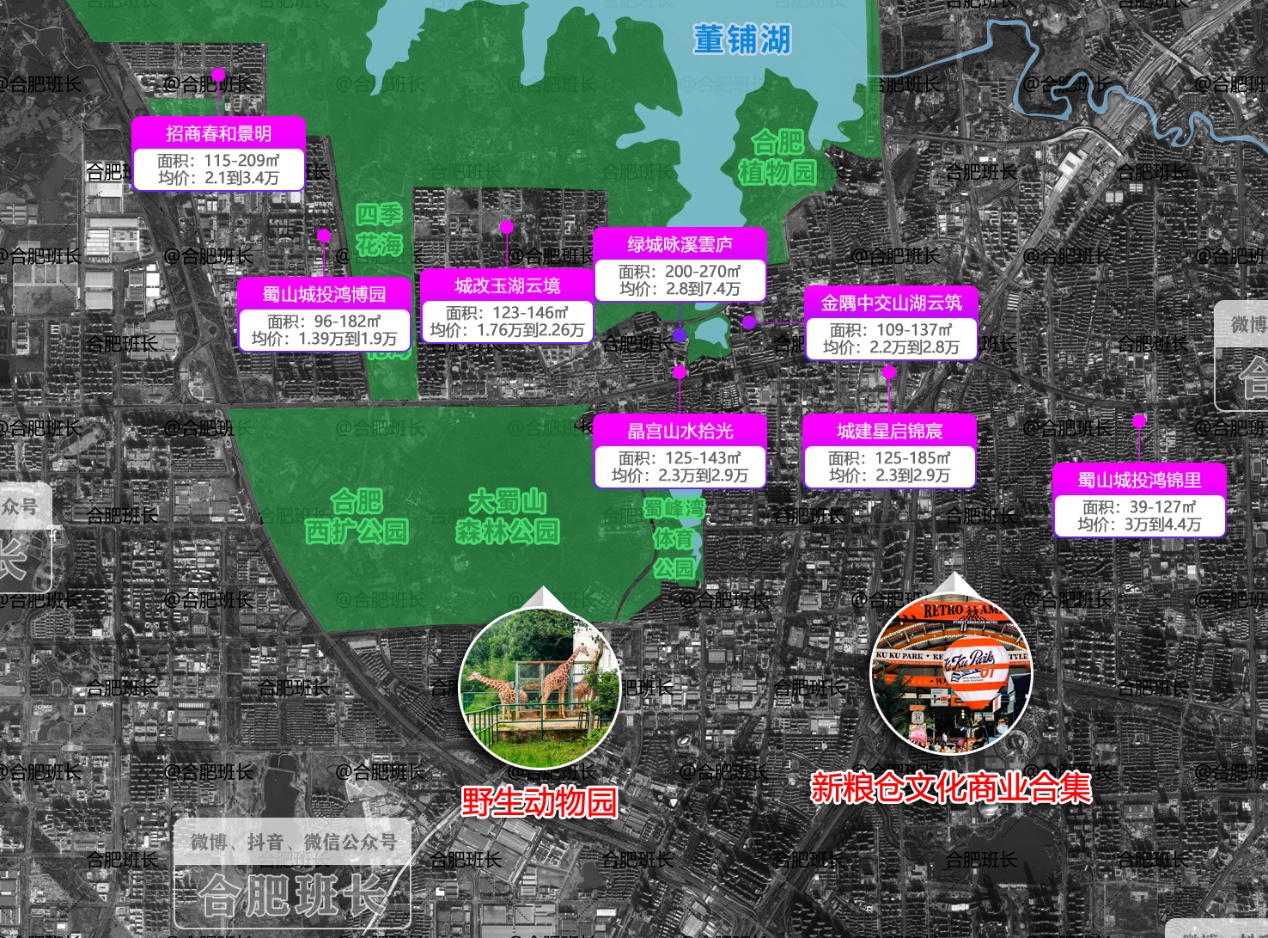 看完四季花海、董铺湖南的楼盘后,可以选择在四季花海或者植物园赏赏景,也可以在看完烟厂的星启锦宸之后去野生动物园、大蜀山或新粮仓,新粮仓以餐饮业态为主,喜欢美食不容错过。
