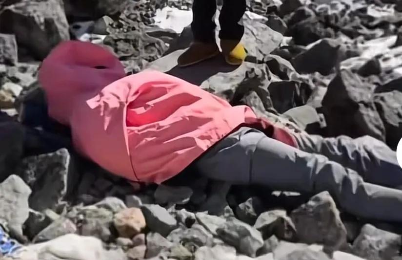 这是事发的画面,一名年轻男子躺在石头上,被红色的衣服覆盖,一动不动:
