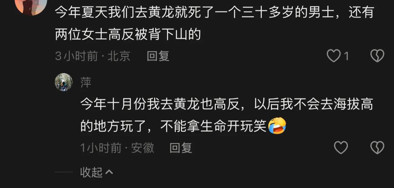 此事引发了网友热议,有北京网友说,今年夏天自己去黄龙时候,就发现一名30多岁的男士女士,还有两位女子高反被背下山。