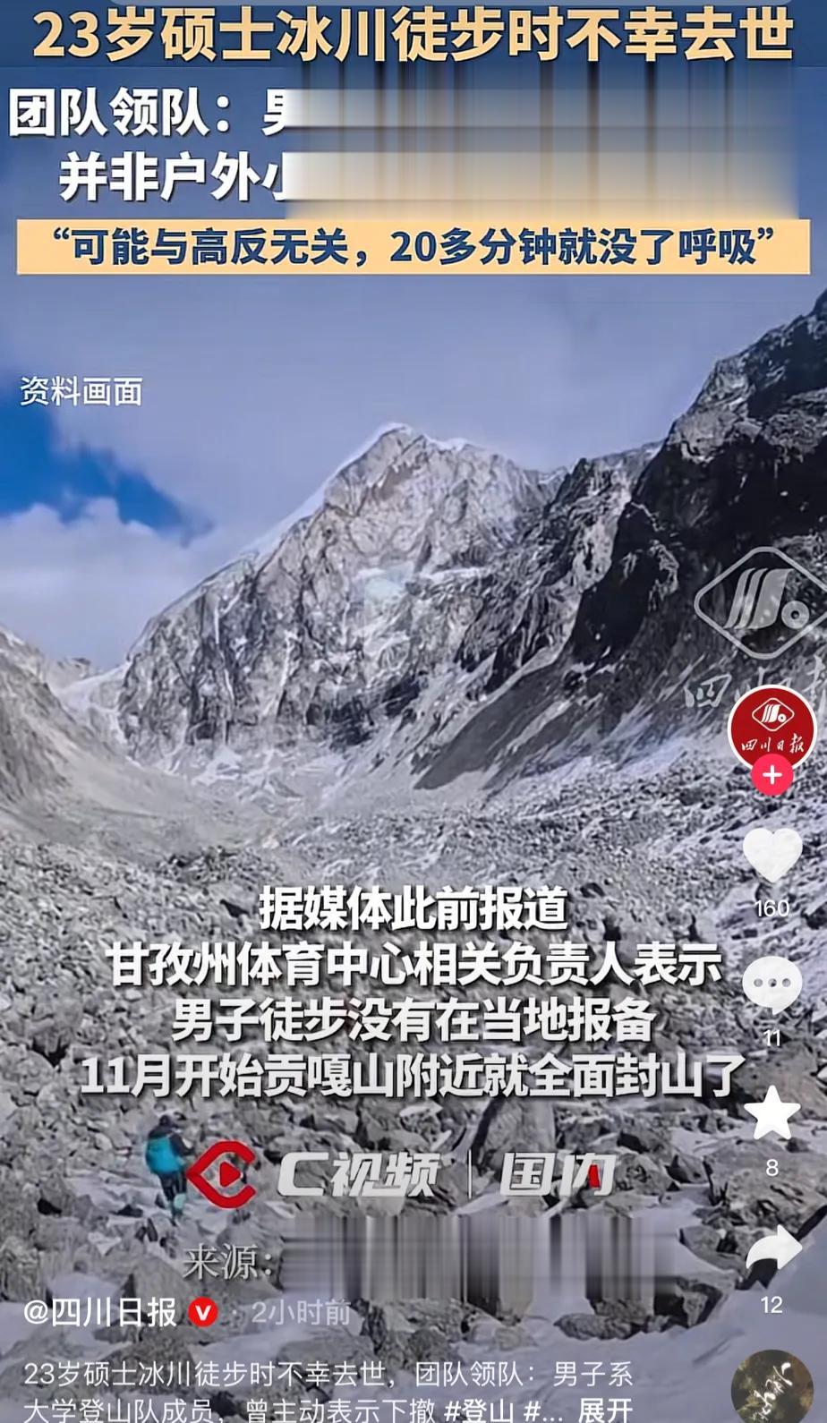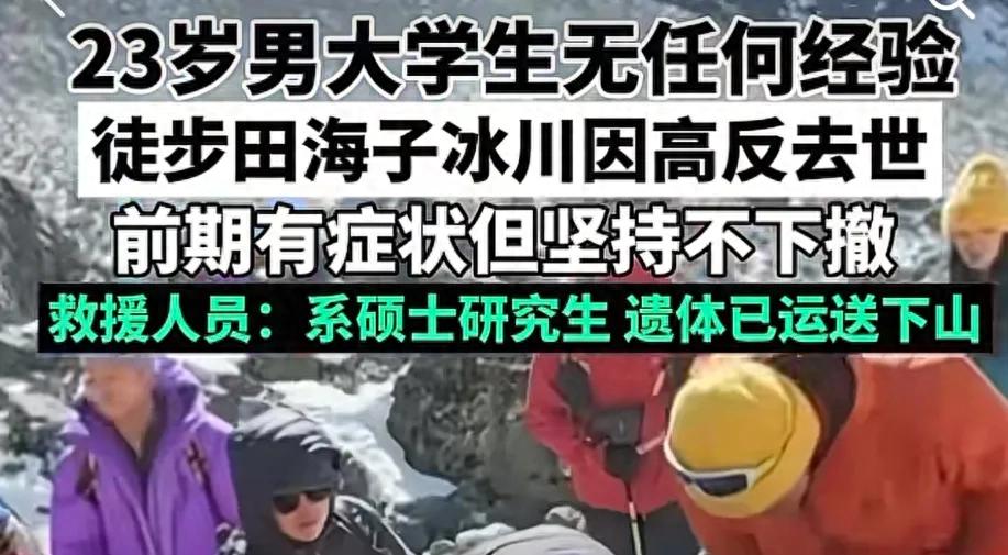 12月22日的媒体报道,12月21晚,有网友发布视频,说一名男子徒步四川甘孜州田海子冰川时候,因为严重高反身亡,知情人曝光,这名男大学生是个新手,上周五报名参团,而且交了248元重庆到康定的往返包车费,他还是大学登山队的成员。