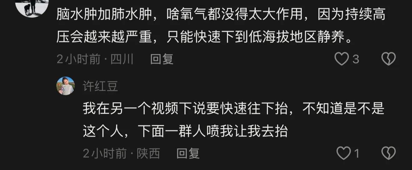 有四川网友说,这种情况下,脑水肿加上肺水肿,氧气不起作用,因为持续高压会越来越严重,最好的施救方法是把人放到低海拔地区静养!