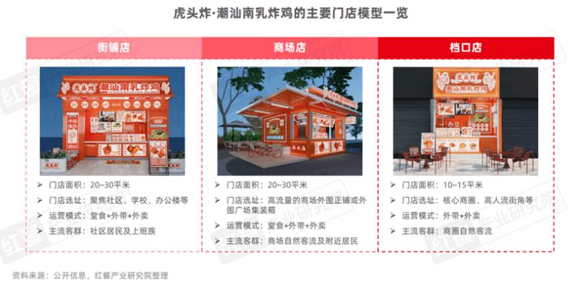 小店型意味着投资小,易复制,试错成本较低。比如虎头炸·潮汕南乳炸鸡,其在广东地区有近10种不同模式的店型,从商场店、外围集装箱店、街铺店到景区流量店、学校店到办公社区店,所有店型都是小型门店,灵活适配各类选址需求,单店最低投资门槛可降至12万元左右。