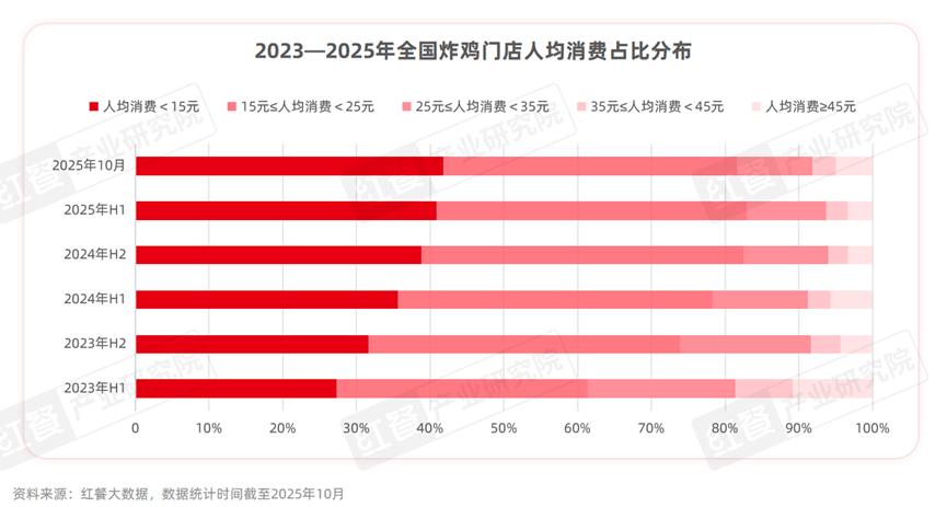 另外,在餐饮市场竞争日益激烈的背景下,炸鸡品类的人均消费也有所下滑。红餐大数据显示,截至2025年10月,全国炸鸡门店的人均消费已降至20元,较2023年年底的22.5元下降了11.1个百分点。