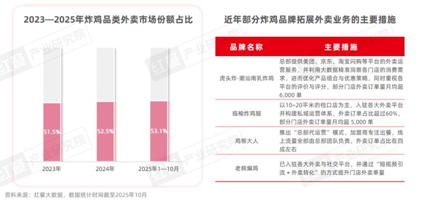 据红餐大数据,2023年以来,炸鸡品类的外卖市场份额占比一直超过50%,且有增长的趋势,2025年1—10月全国炸鸡门店的外卖市场份额占比达到了53.1%,较2023年提升了1.6个百分点。