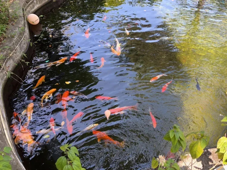 二楼是简洁温馨的咖啡厅,楼下宴会用途,外围有锦鲤池,幽深清澈,鱼翔潜底。