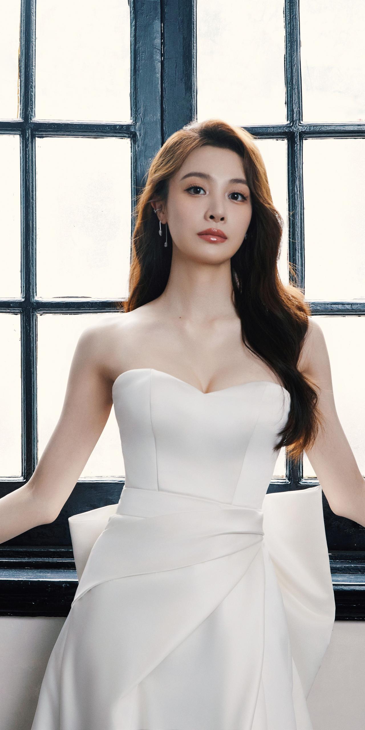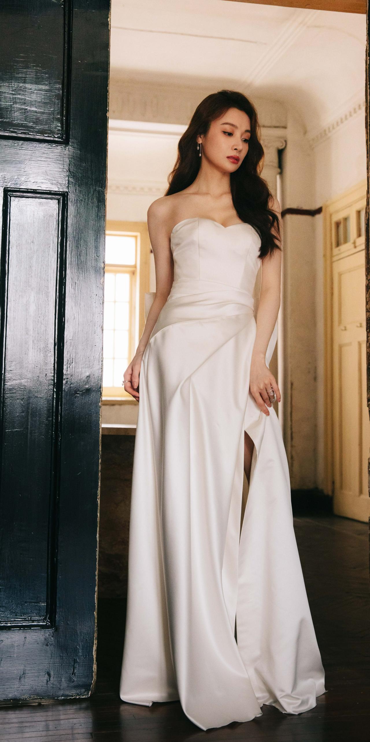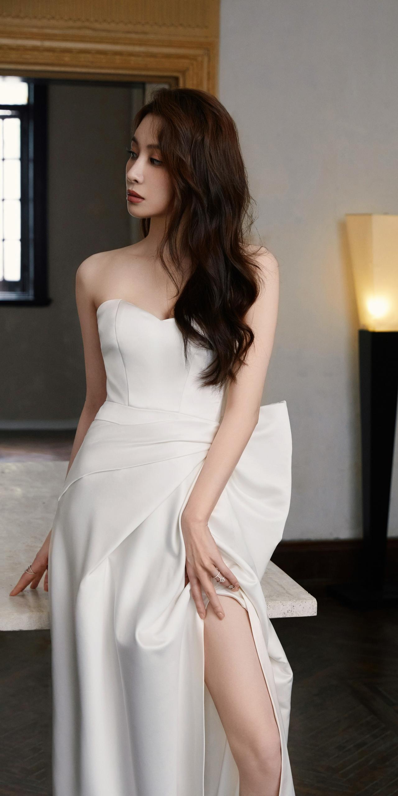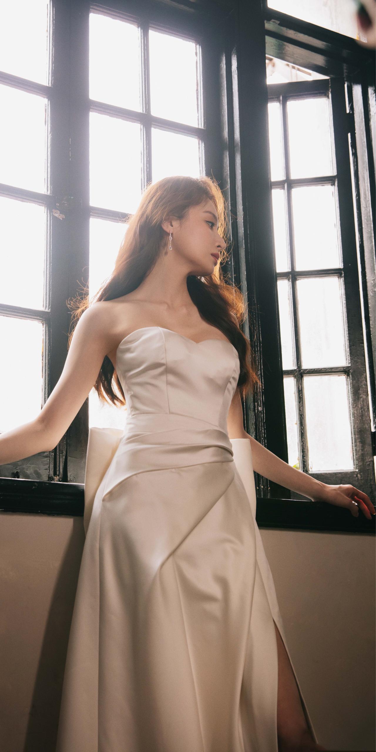 隆妮白色抹胸裙手机壁纸。