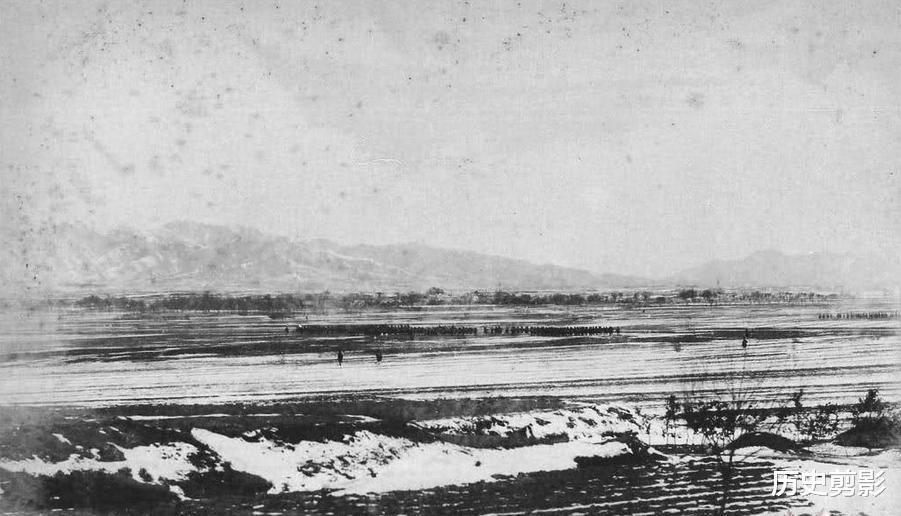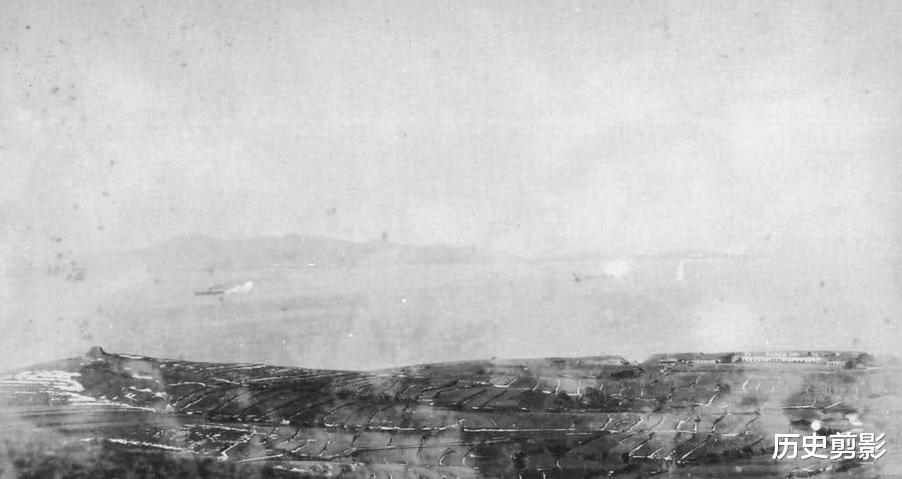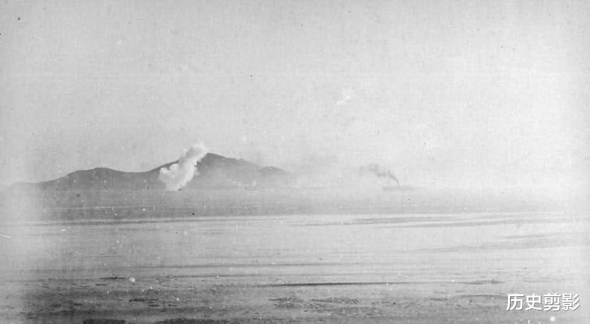 1月30日,杨家滩附近,北洋水师军舰炮击日步兵第5联队(冒黑烟是“镇远”舰,其右侧是“靖远”或“济远”舰