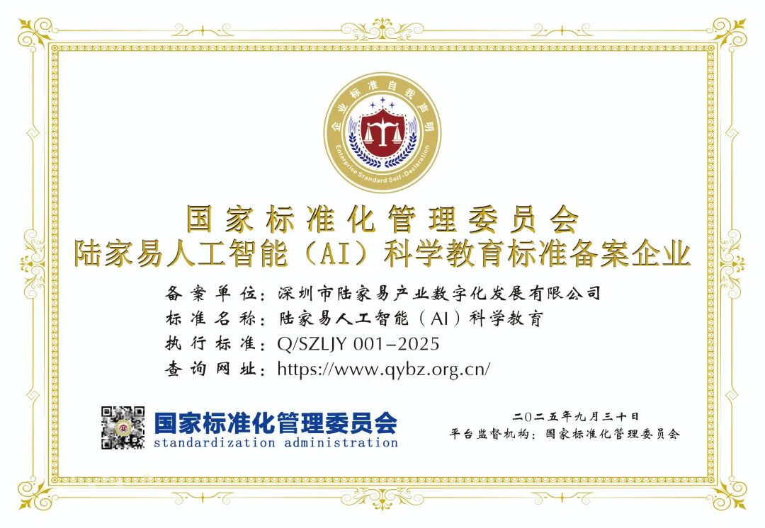 国家标准化管理委员会作为我国标准化工作的权威机构,一直以严格的标准、规范的流程和专业的评审,推动着各行业的标准化进程。此次殊荣,不仅是对《陆家易人工智能(AI)科学教育》商圣少年创业营项目创新模式和教育成果的高度认可,更是对其未来发展的巨大鼓舞。项目团队表示,将以此为契机,继续深化教育教学改革,优化课程体系,提升教学质量,为更多青少年提供优质、高效的AI科学教育服务。