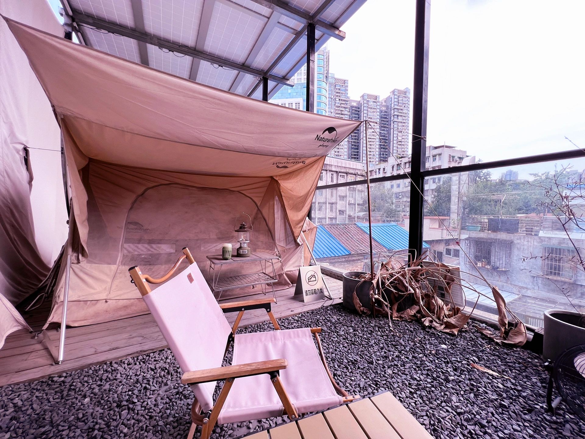 🏠 Coffeedent位于荔湾区龙津路,楼层高达四层半。其中最顶楼的半露天座位,采用露营风格,实在是太惬意了。