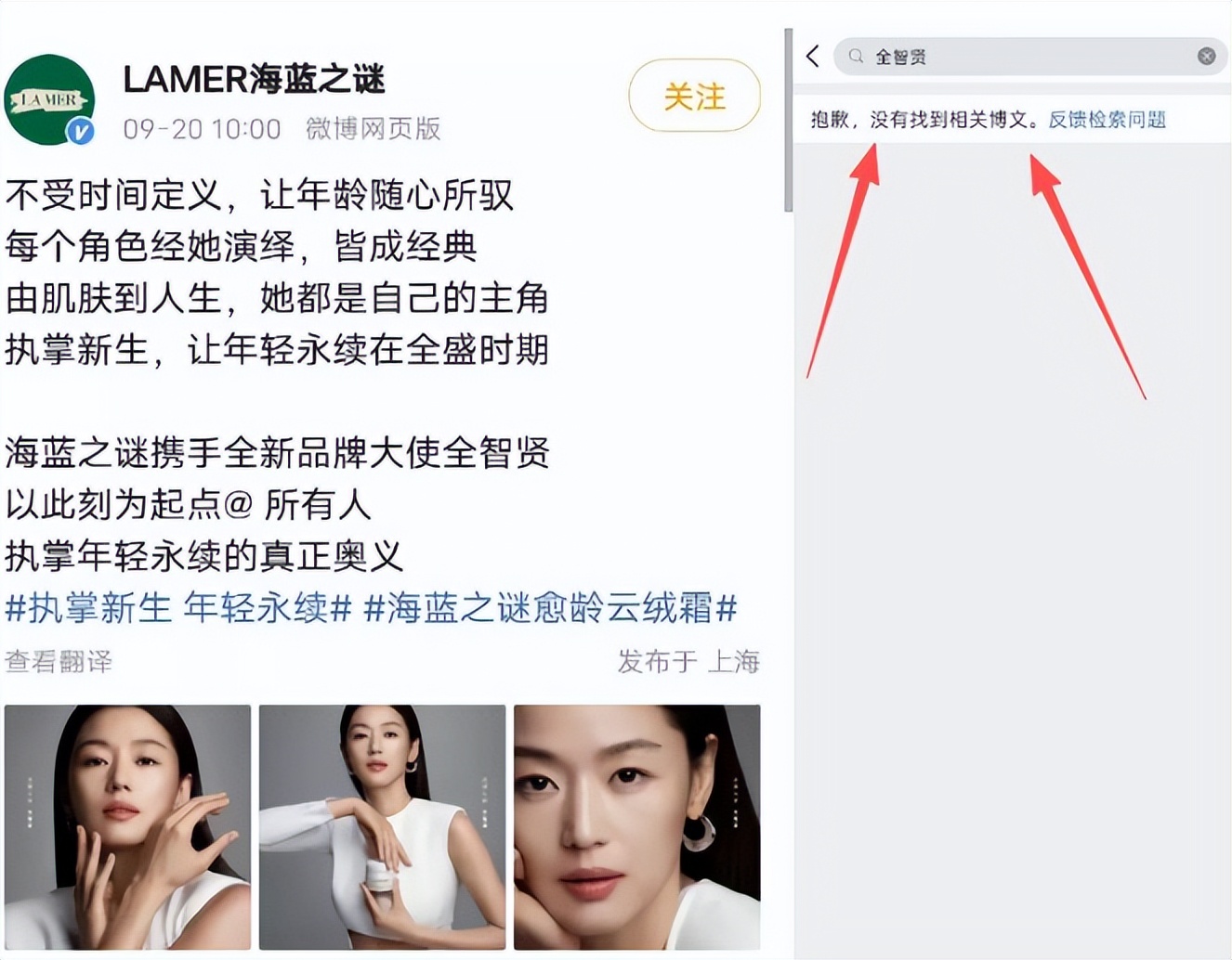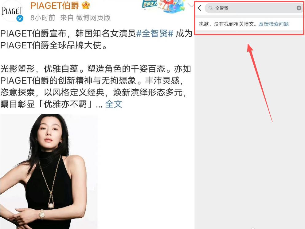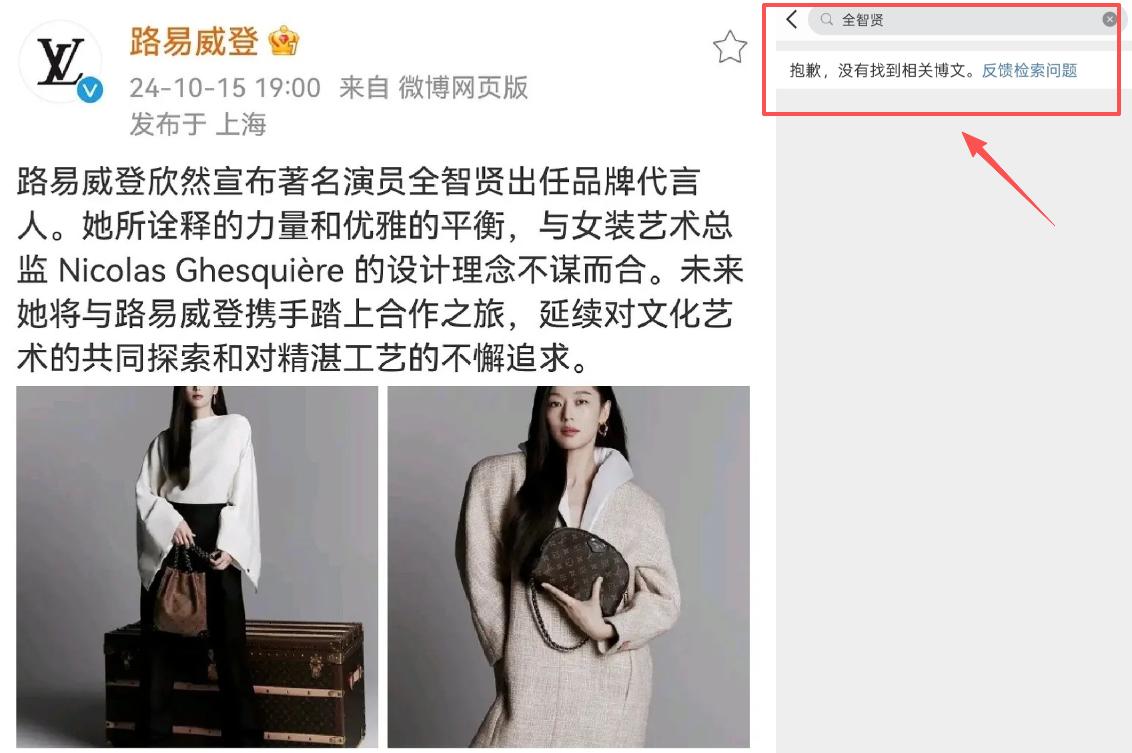 面对汹涌舆情,三大高奢品牌的反应堪称现实版 “速度与激情”。9 月 19 日,刚与全智贤签约半年的伯爵珠宝率先行动,删除所有宣传物料,但一线城市 CBD 的巨幅地广尚未来得及更换,引发网友持续督促清理。次日,海蓝之谜先删除中国区物料却保留海外内容,被骂 “两面派” 后,于 21 日紧急清空全球平台相关内容,才勉强平息怒火。LV 则更为隐蔽,不仅删除宣传广告,还在微博小程序屏蔽 “全智贤” 关键词,将其代言的旅行箱广告替换为其他模特。业内测算,这三大代言的丢失将给全智贤带来上亿损失。