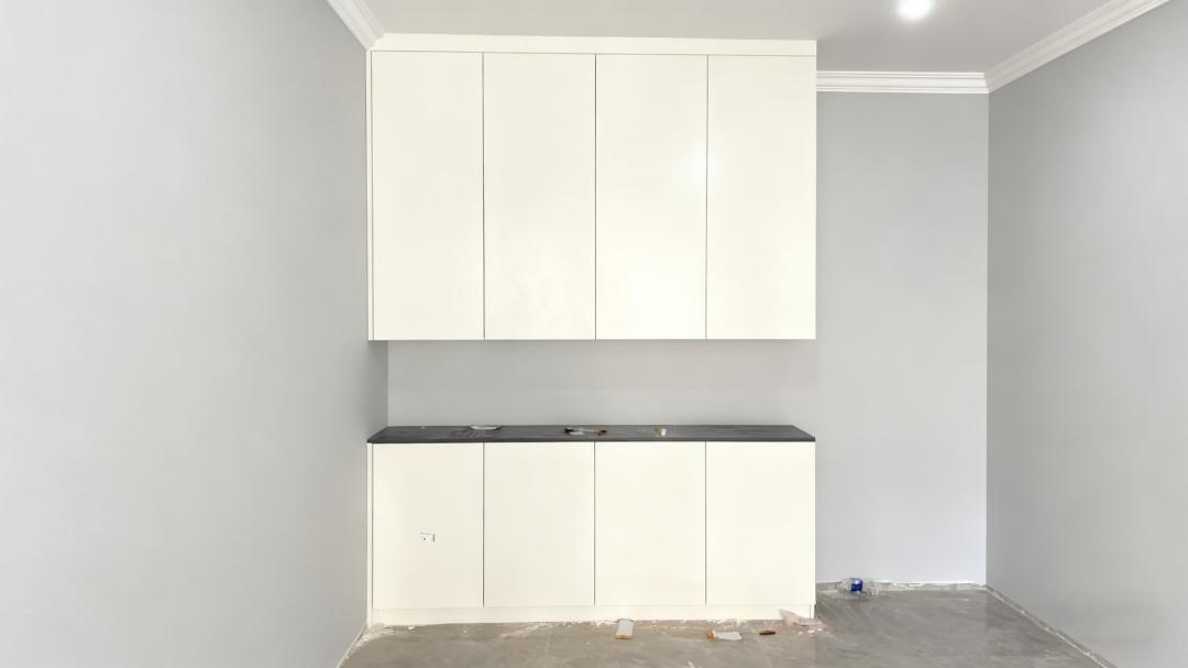 正确做法:厨柜、餐边柜等高频接触的柜子,避免使用肤感膜柜门。选择哑光烤漆板,它视觉效果接近肤感膜,但抗污性更胜一筹。