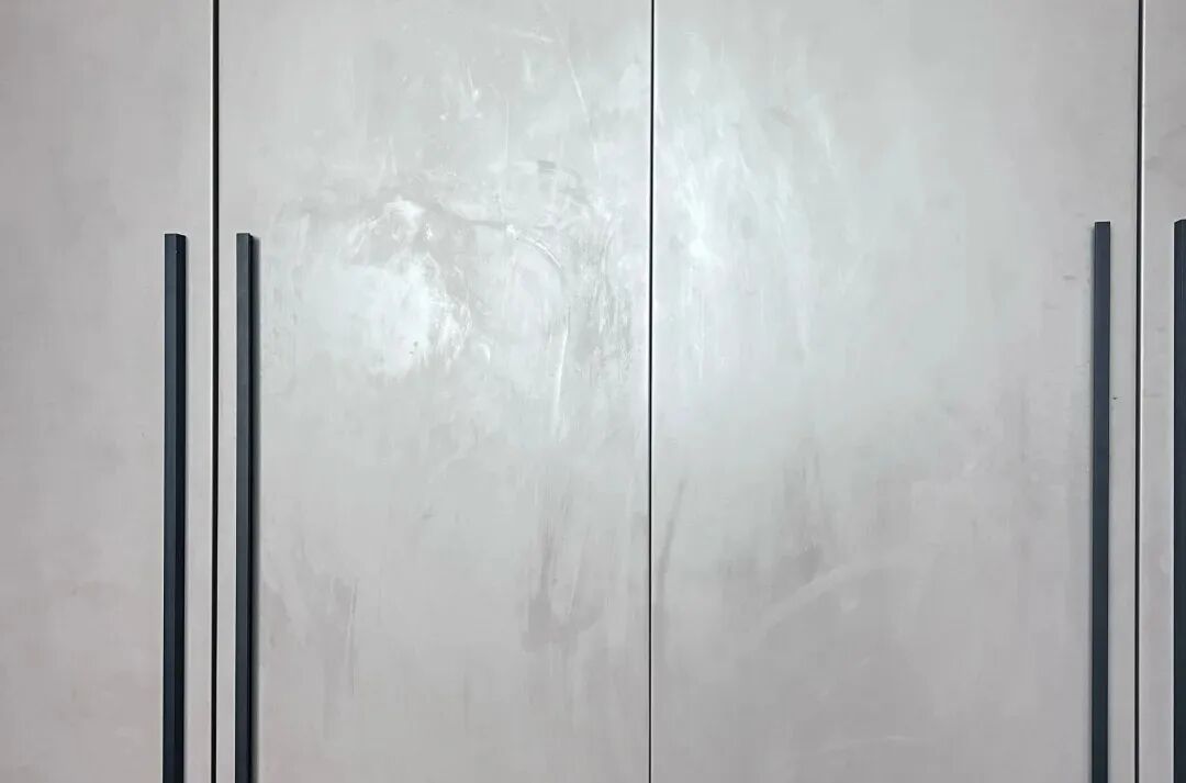 前两年肤感膜特别火,摸起来细腻顺滑,看着高级,很多人跟风选,结果住进去才发现“指纹收集器”——做饭后手上沾点油,碰一下柜门就留下印子;孩子小手脏乎乎的,一摸就是黑印;就算是干净的手,也会留下汗渍印,一天擦3遍都擦不完。