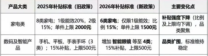 一是补贴强度下降了。25的家电以旧换新国补是一级能效补贴20%,二级能效补贴15%。26年调整为只补贴1级能效或水效产品,二级能效产品不再参与补贴。