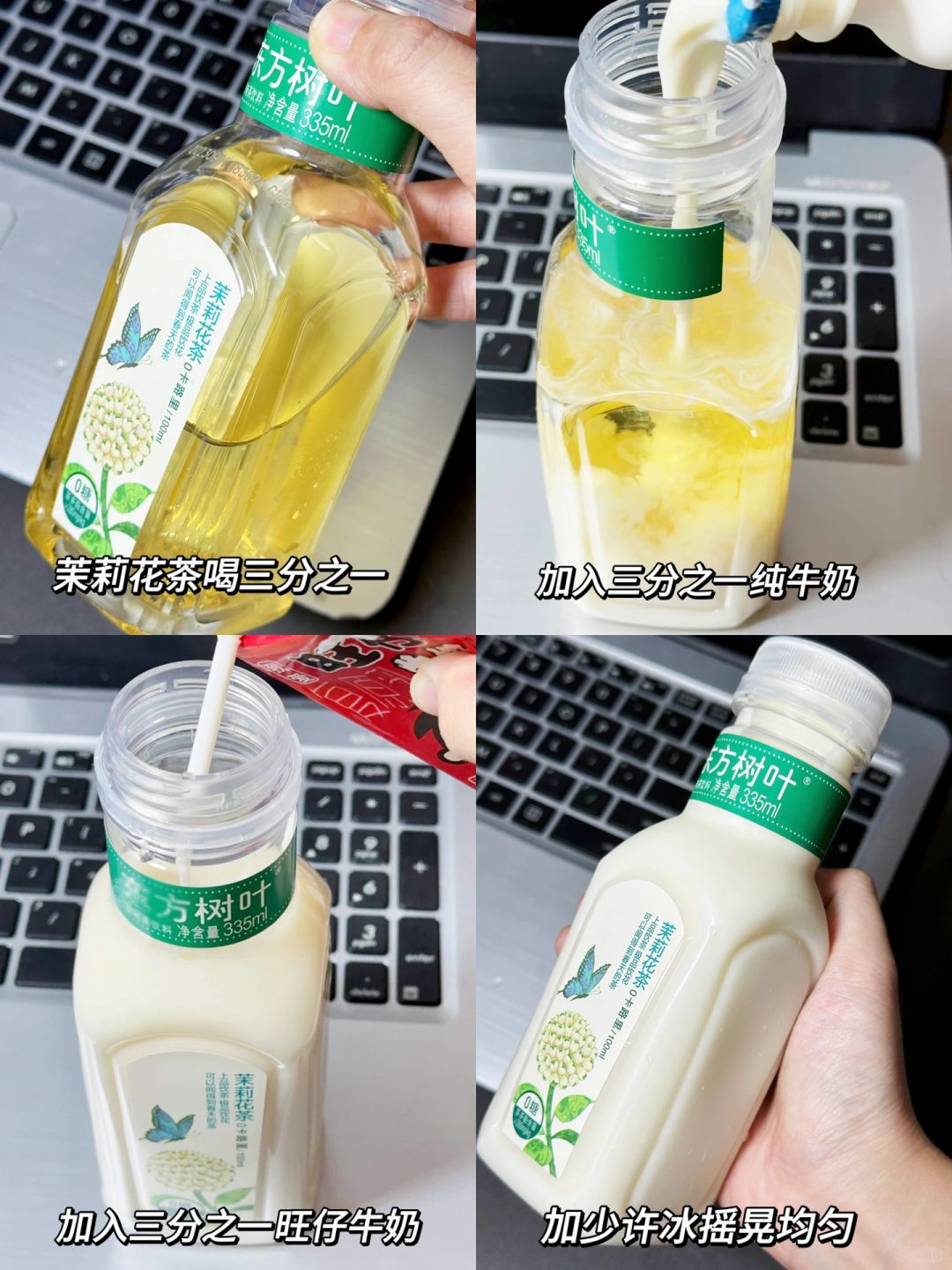 感谢网友分享的配方!!!! 霸王茶姬的伯牙绝弦被我复刻出来了! 奶香奶香的好清爽! 💕混合着茉莉花香! 茉莉花茶➕纯牛奶➕旺仔牛奶=2:1:1 做法简单姐妹们一定要试试!! ! 真的好好喝!