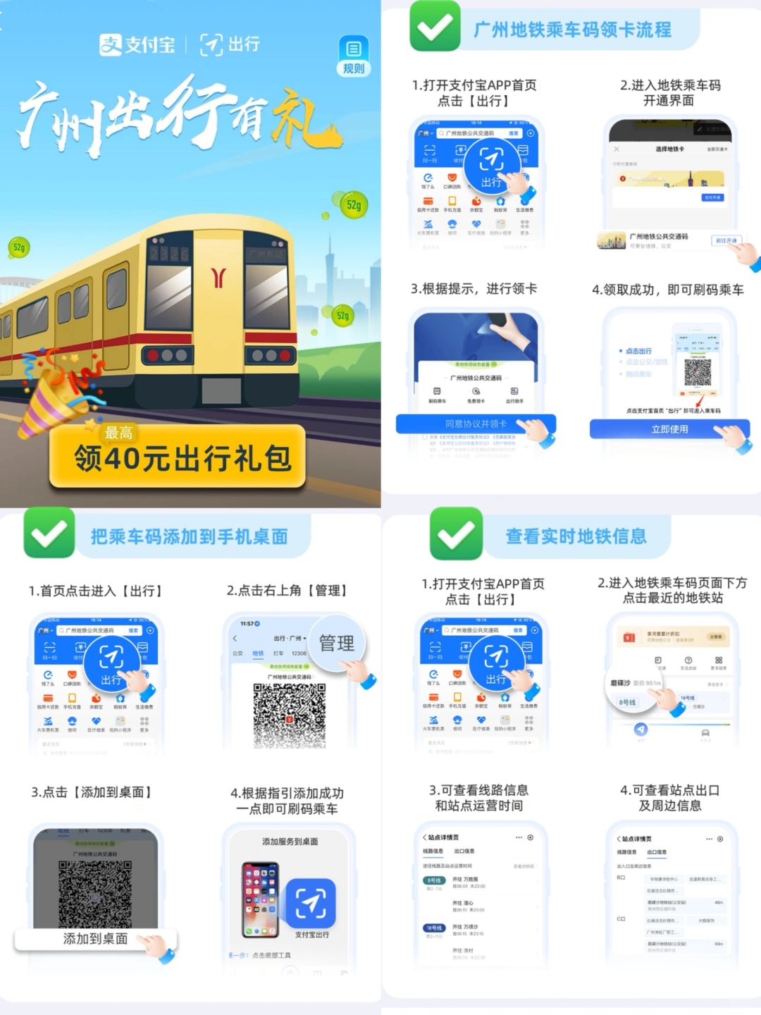 📱zfb点击【出行】,还能在“乘车码”下方展示的站点检索功能里,一键查看地铁站点线路信息、出入口及周边信息,️就算第一次来广州也不迷路啦!