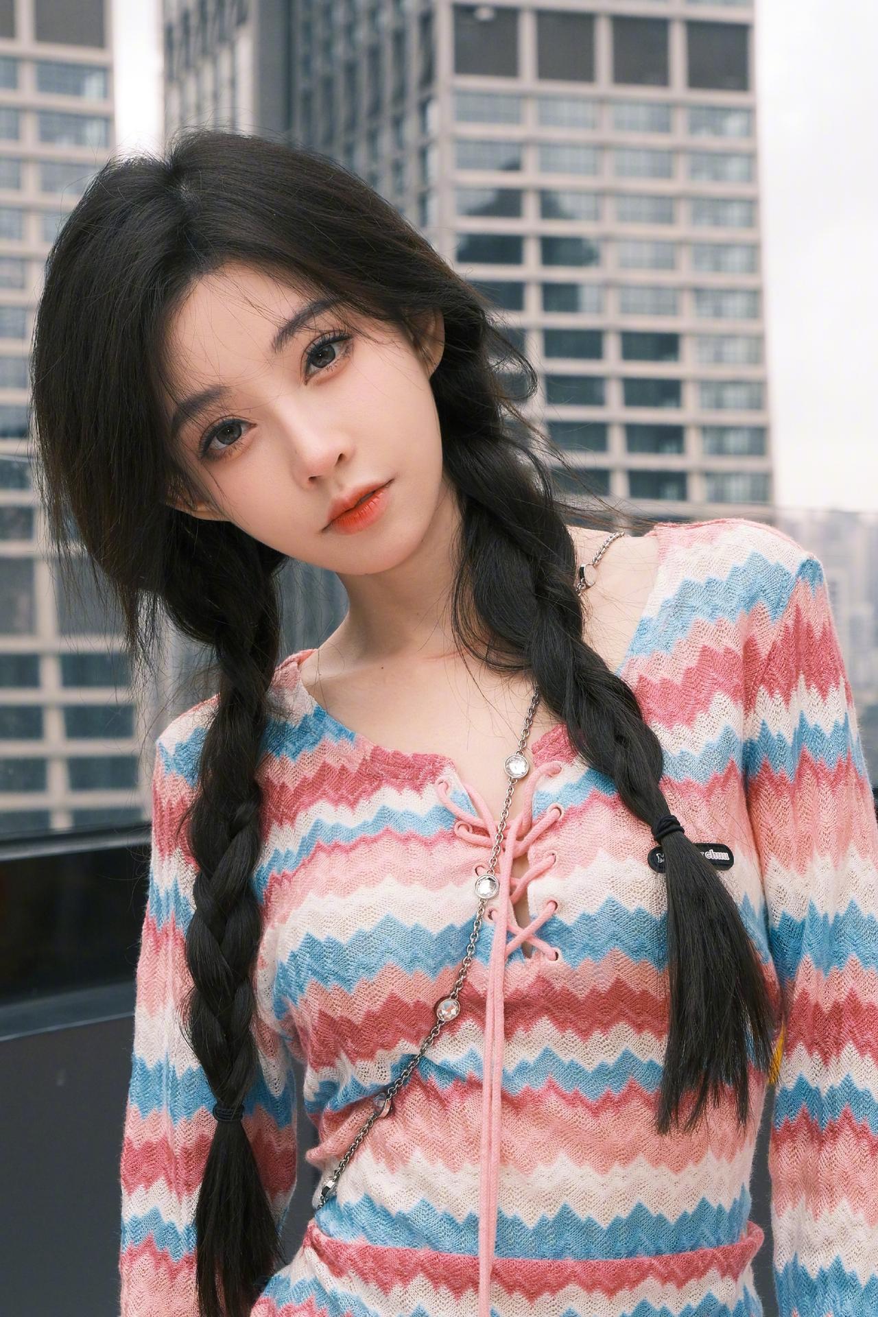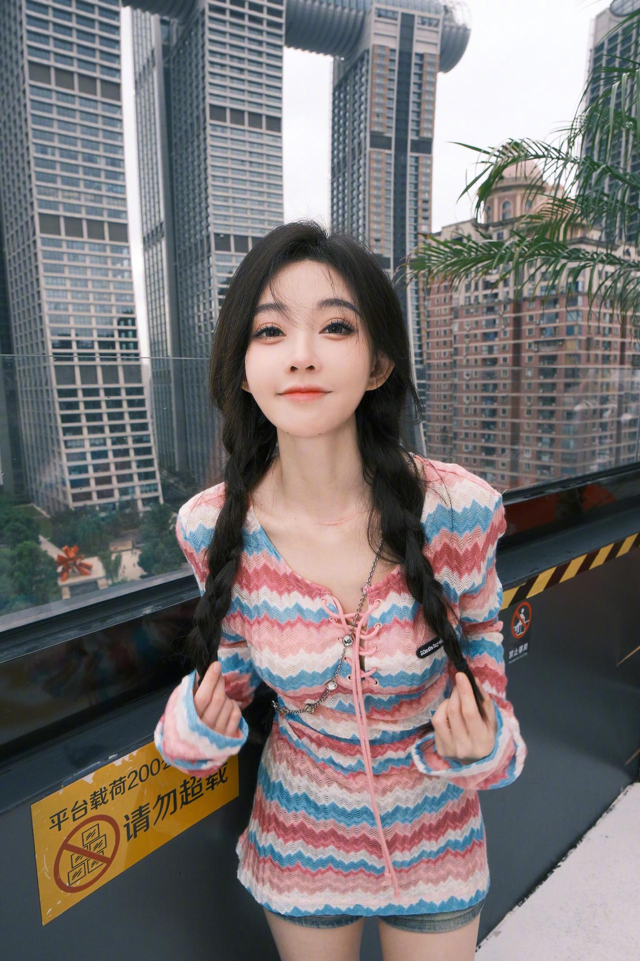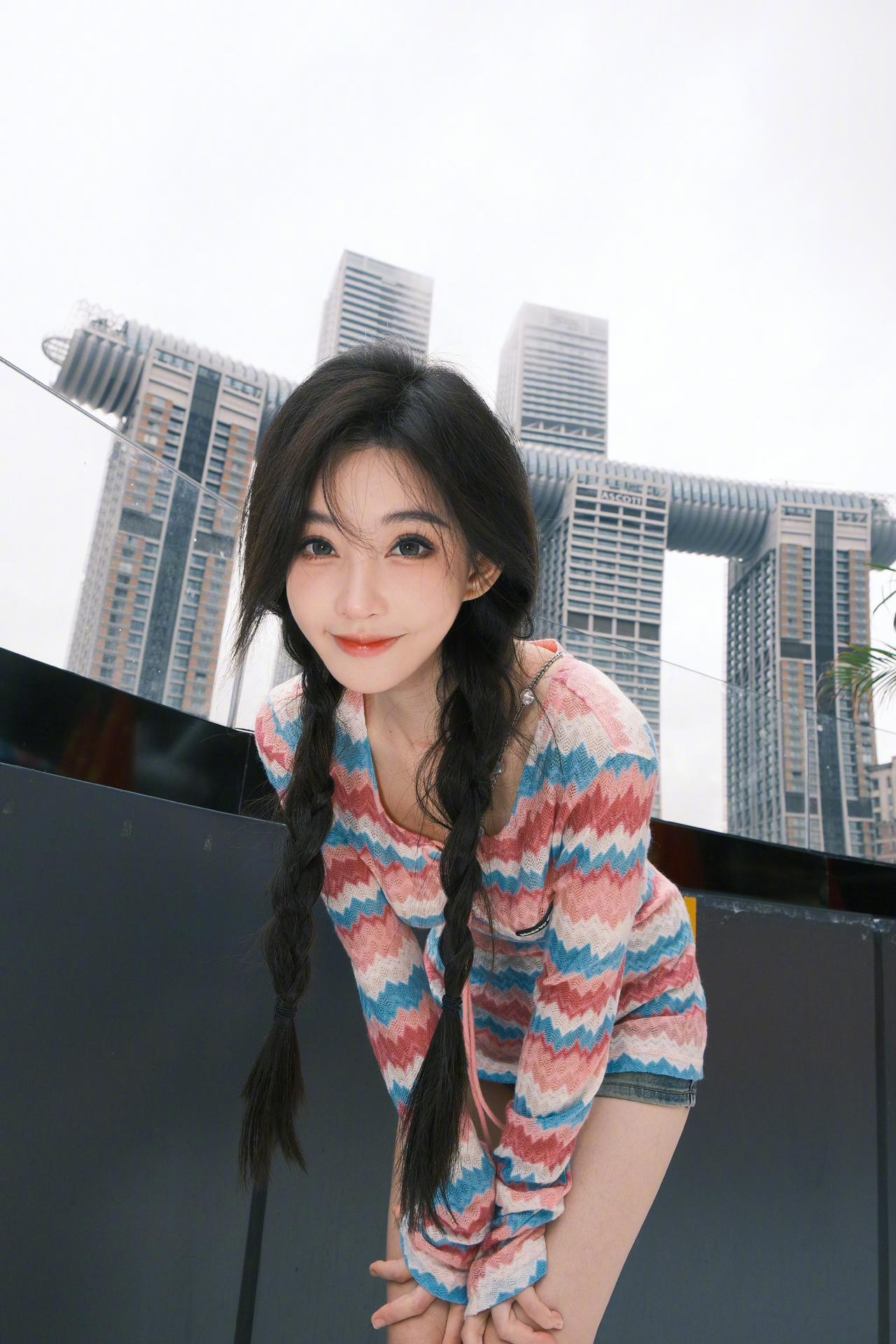 冯提莫秋日街拍写真组图:麻花辫搭配一身条纹穿搭,甜美可人。#妙笔生花创作挑战##秋日生活打卡季#