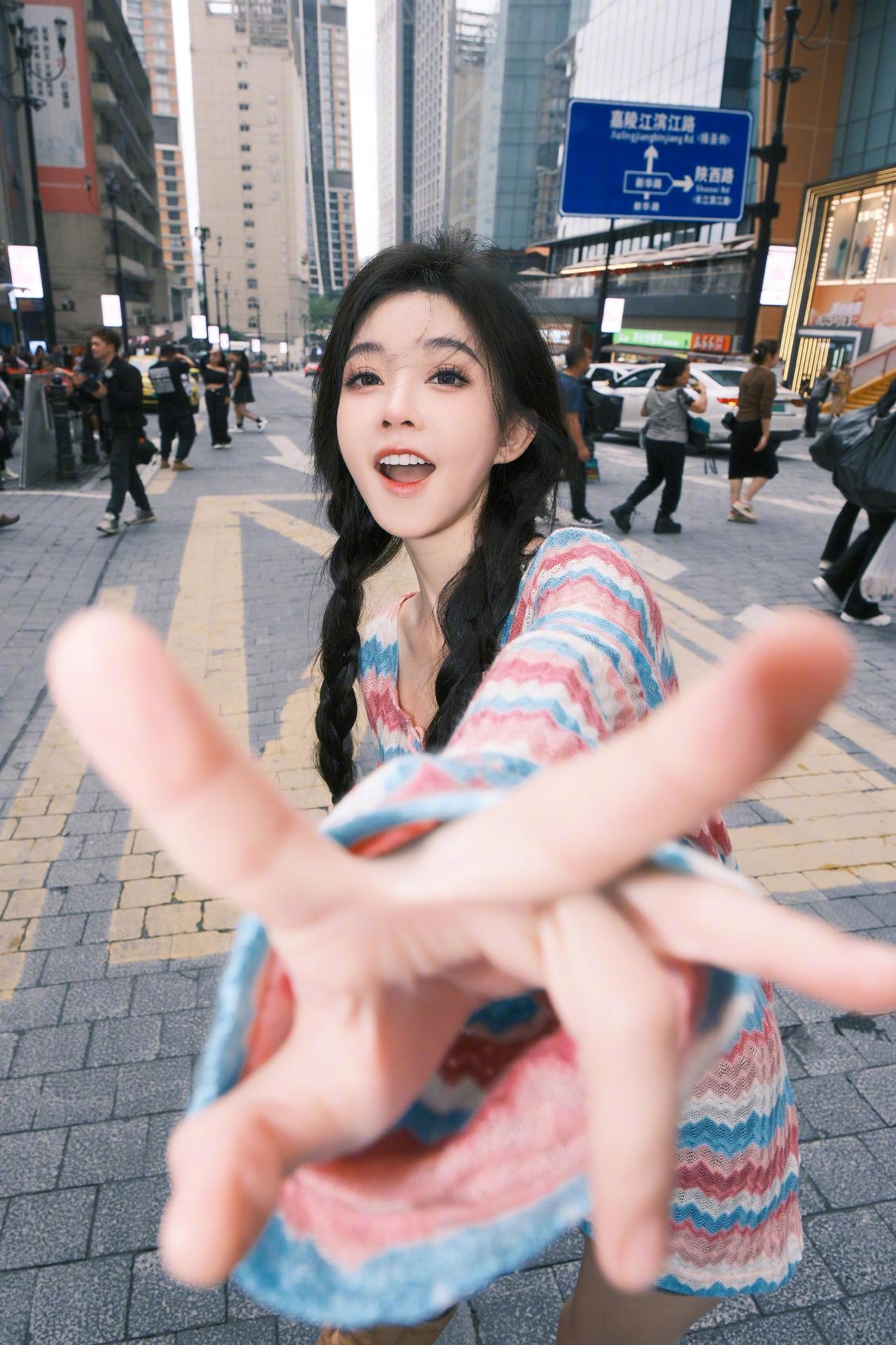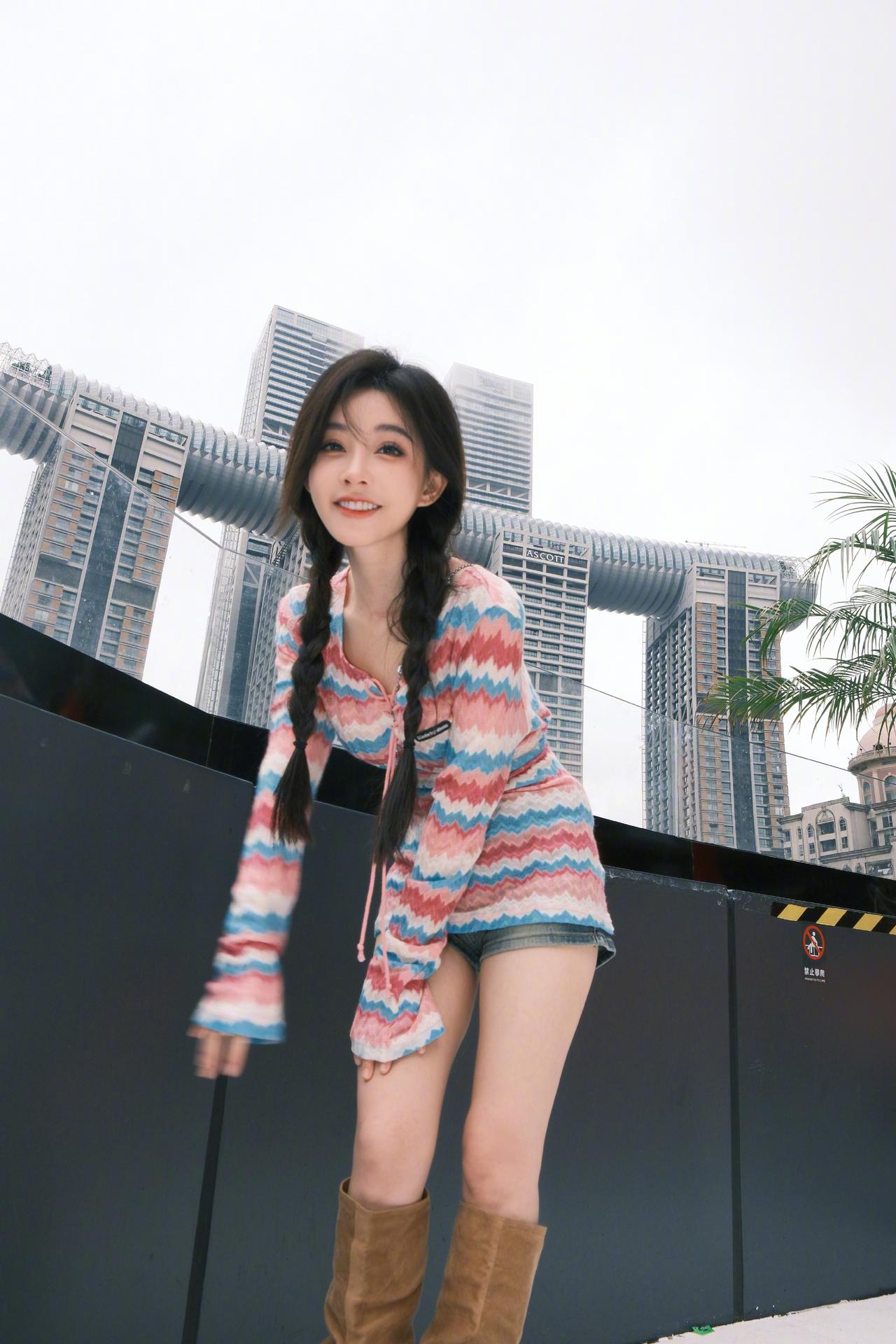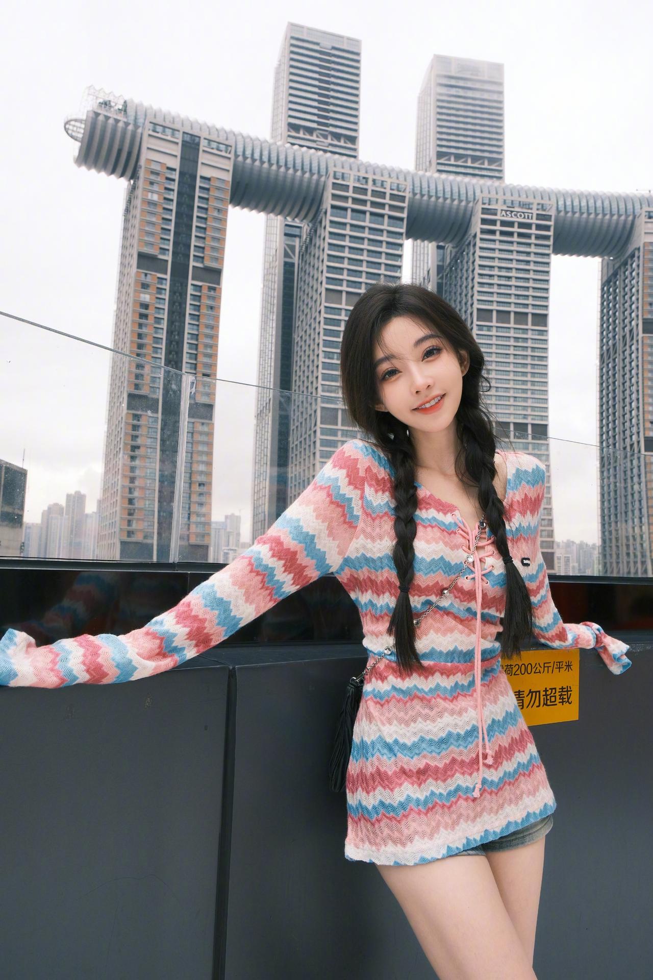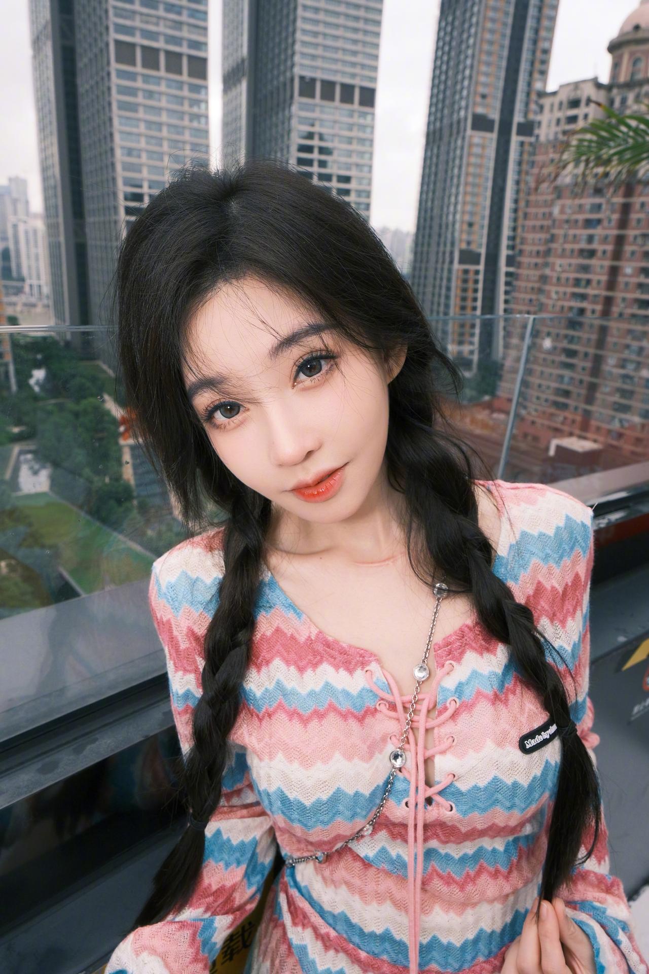 冯提莫秋日街拍写真组图:麻花辫搭配一身条纹穿搭,甜美可人。#妙笔生花创作挑战##秋日生活打卡季#