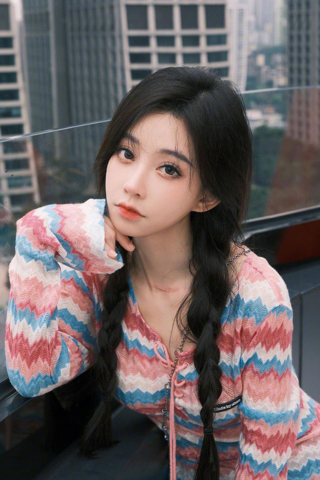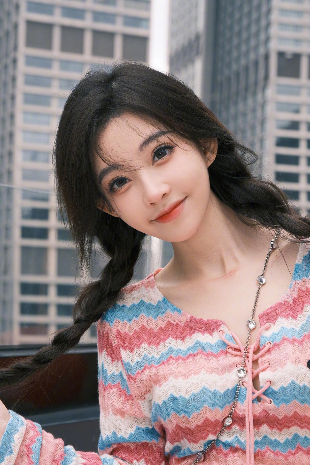 冯提莫秋日街拍写真组图:麻花辫搭配一身条纹穿搭,甜美可人。#妙笔生花创作挑战##