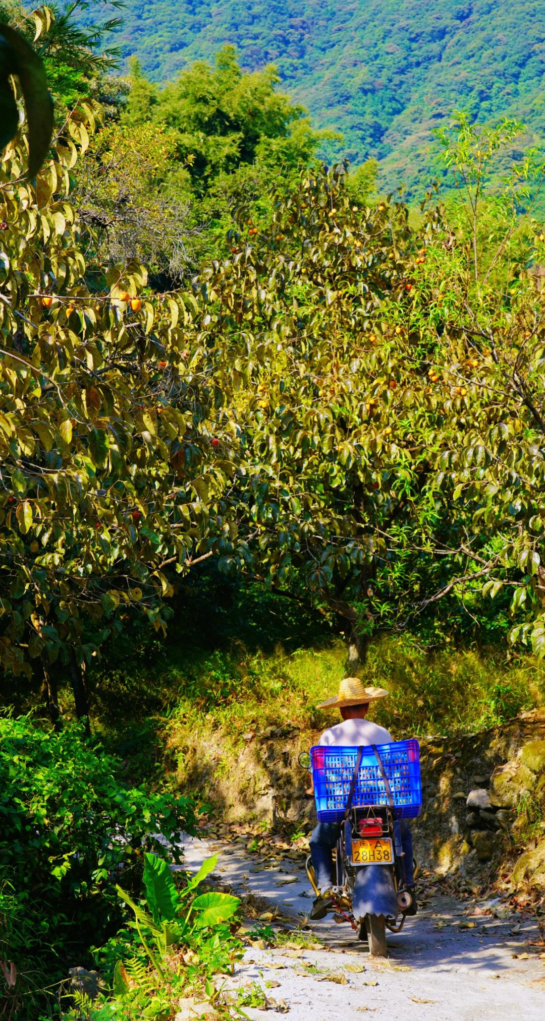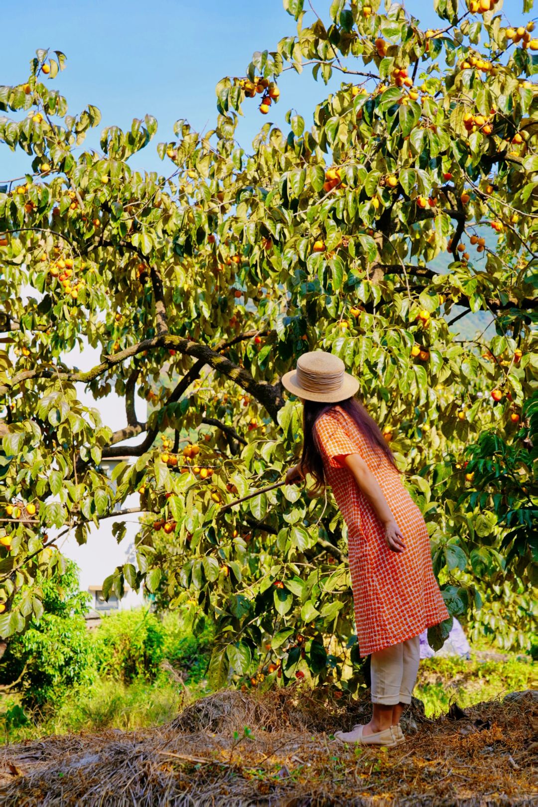 ④、沿着“双凤山罗溪香村客栈”旁的小路走进去,沿着山路有很多柿子树,这里的柿子树不高,很轻松可以拍到采摘柿子的照片