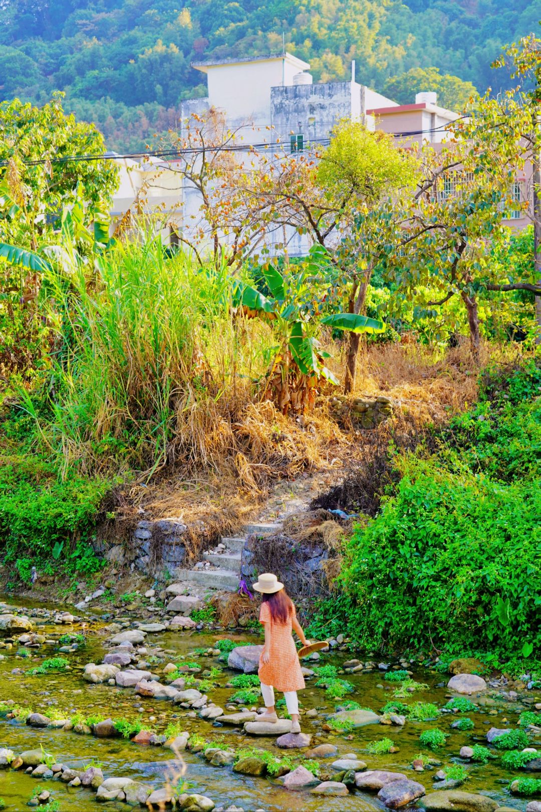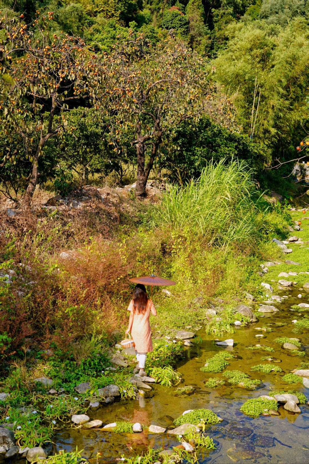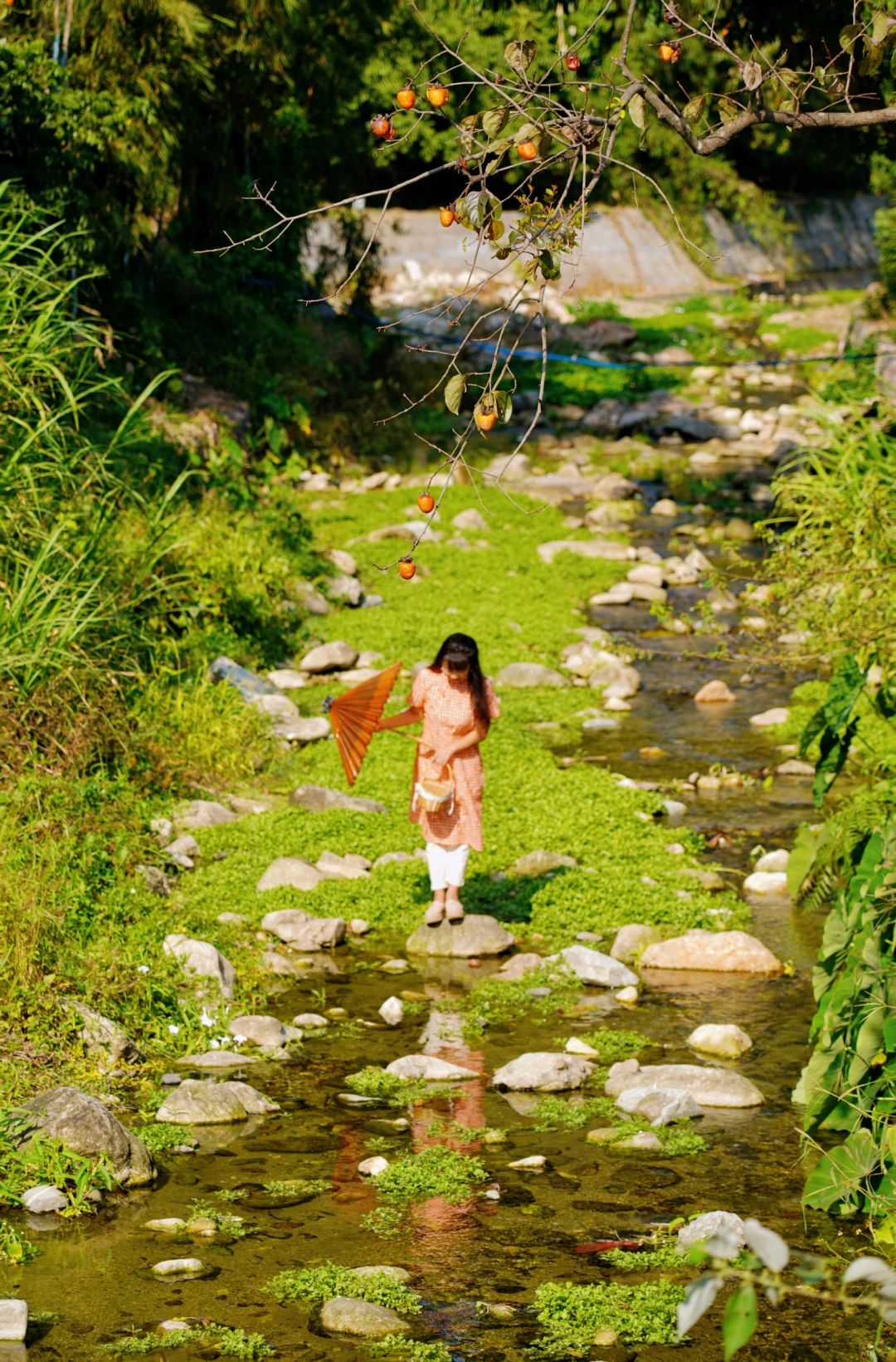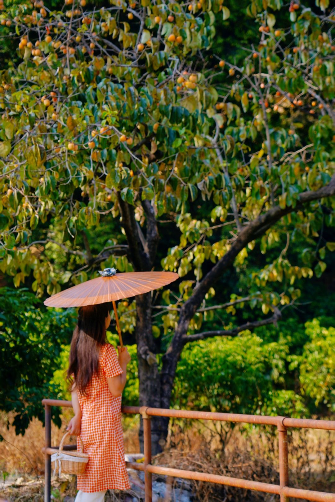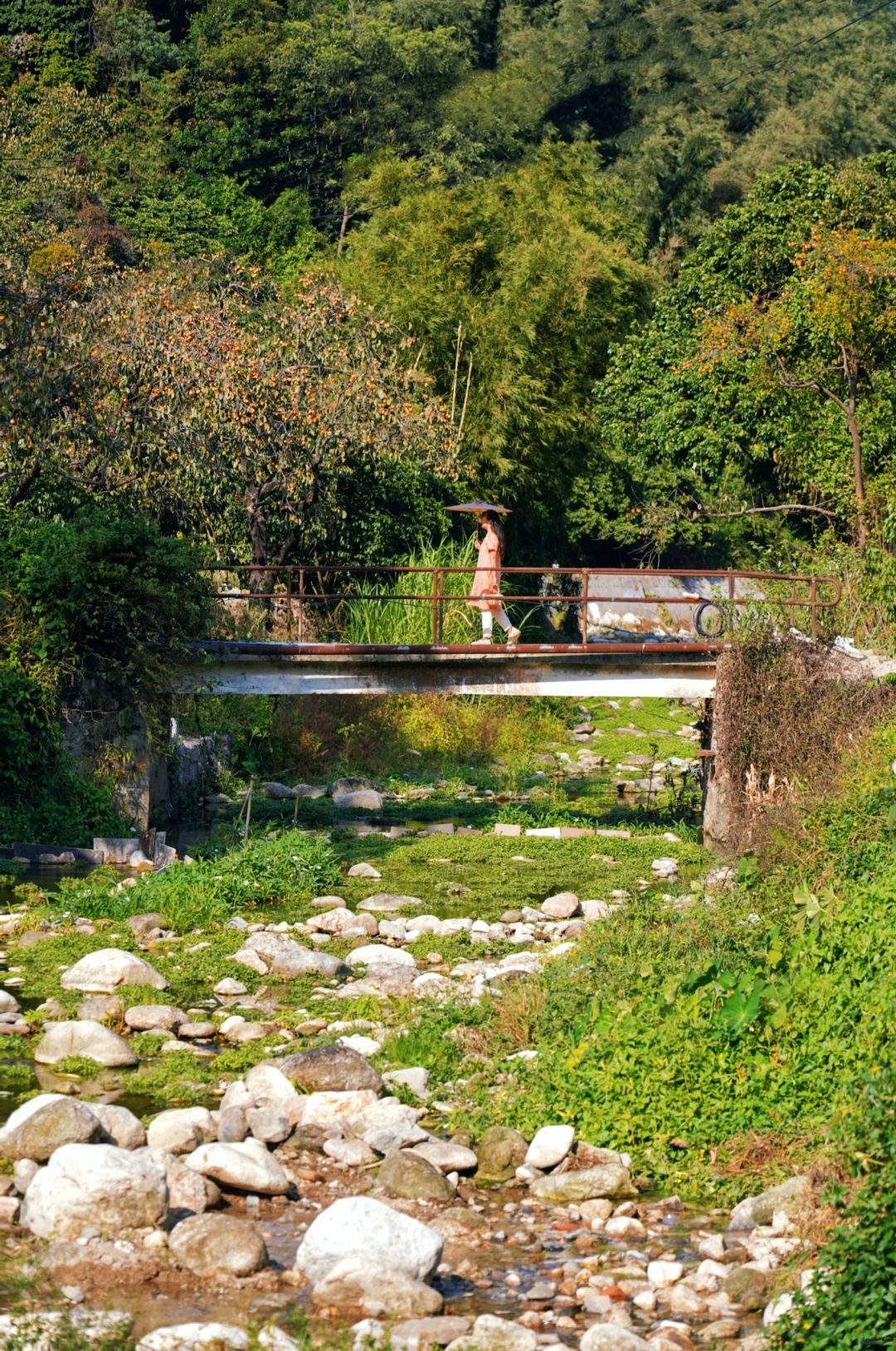 旁边的河道往前,有座铁红色的小桥,小桥后有一排柿子林,拍照也很好看
