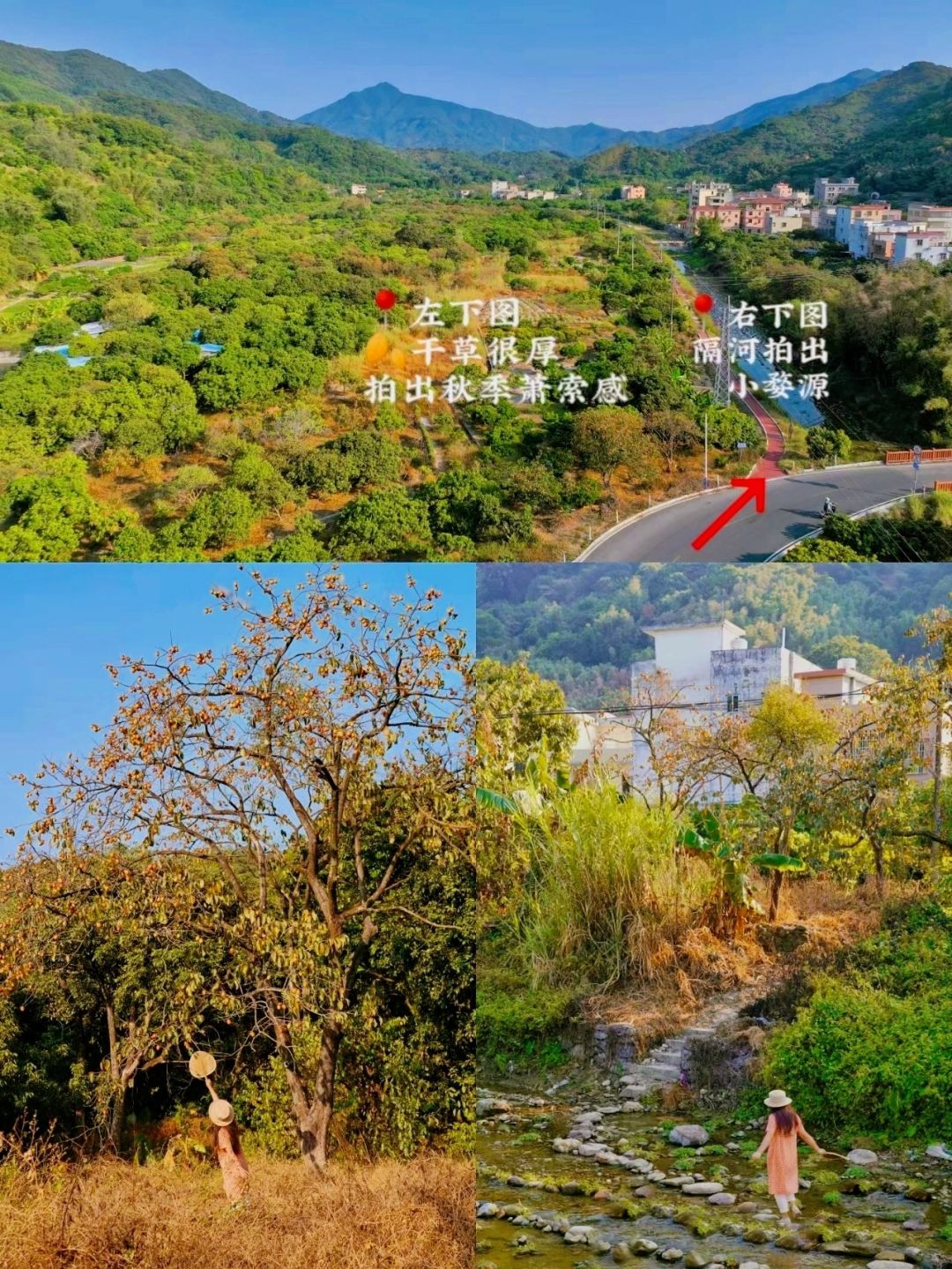②、先导航到达“上罗亮点农家乐”,农家乐对面有块免费的公共停车场,停好车之后往罗洞河绿道走,河边的一排白色农舍作背景,有点儿婺源的感觉。而旁边的果园走进去,有一片枯草地,再加上这儿的柿子树叶似乎掉得多些,更有秋天的萧瑟感