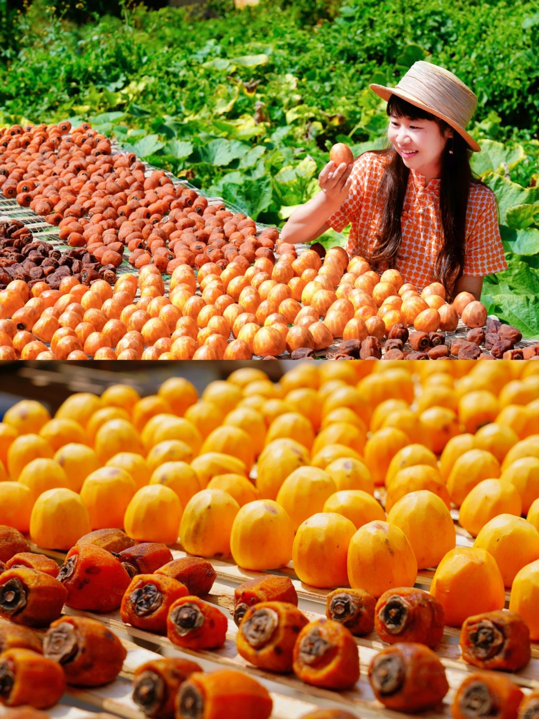 挂满枝头的柿子,屋顶院子里晒着的柿子干
