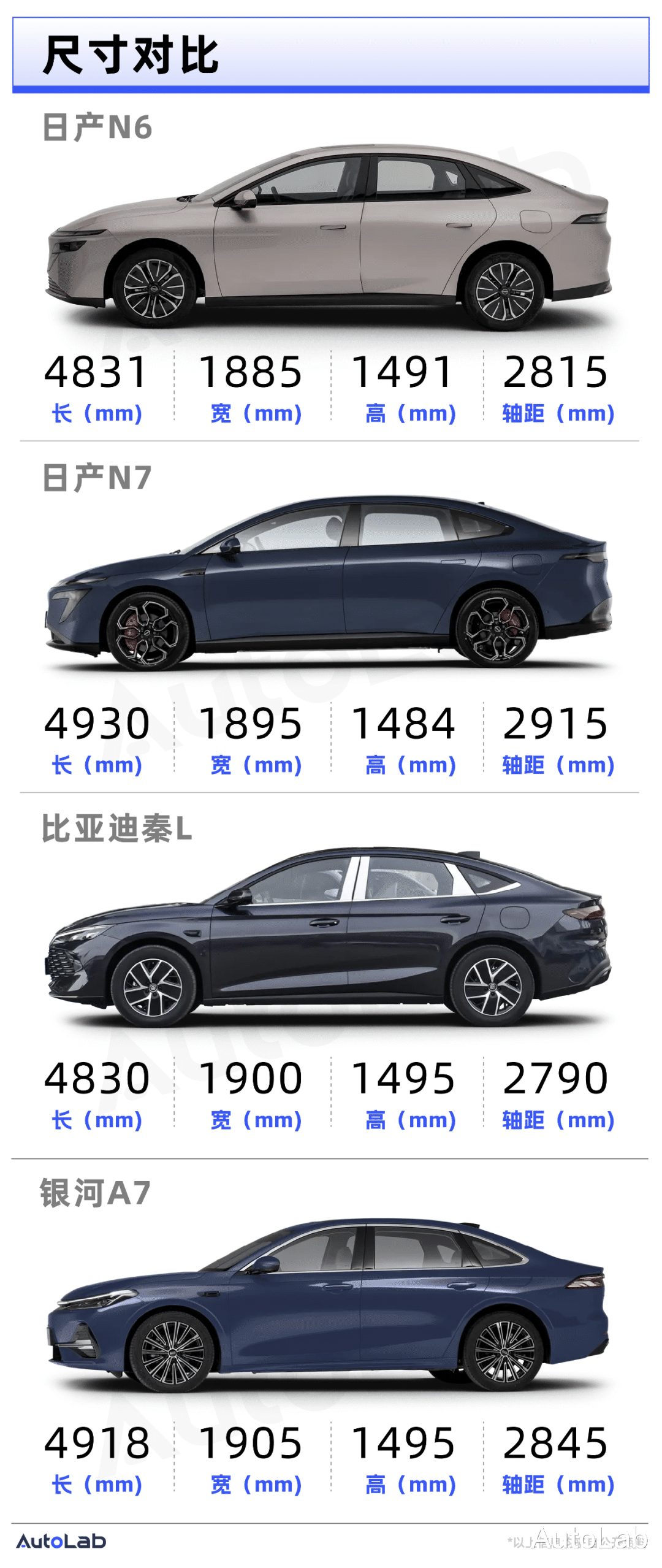 尺寸上,N6可以看作N7的标轴版,车长和轴距各砍10厘米,但4.83米仍然算中级车,和比亚迪秦L非常接近。