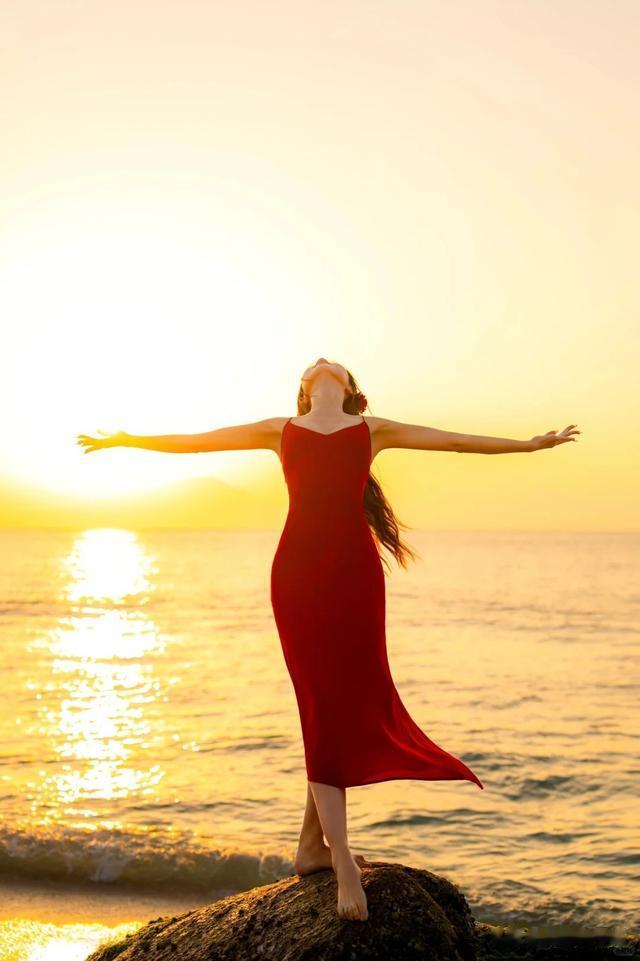 2. 张开双臂,拥抱海风背对夕阳,双臂张开,仿佛在享受轻柔的海风。这个姿势充满了自由与豪情,让人感受到海边的广阔与美好。