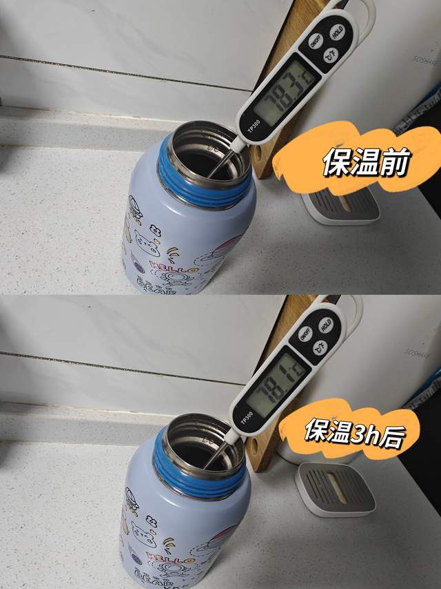 清晨8点,我将78.3℃的沸水注入杯中密封。中午11点(静置3小时后),用温度计测量杯口水温,显示约78.1℃,依旧滚烫,随时能喝到温热饮品。
