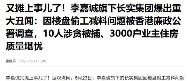 金融界2025-05-23——又摊上事儿了!李嘉诚旗下长实集团爆出重大丑闻:因楼盘偷工减料问题被香港廉政公署调查,10人涉贪被捕、3000户业主住房质量堪忧