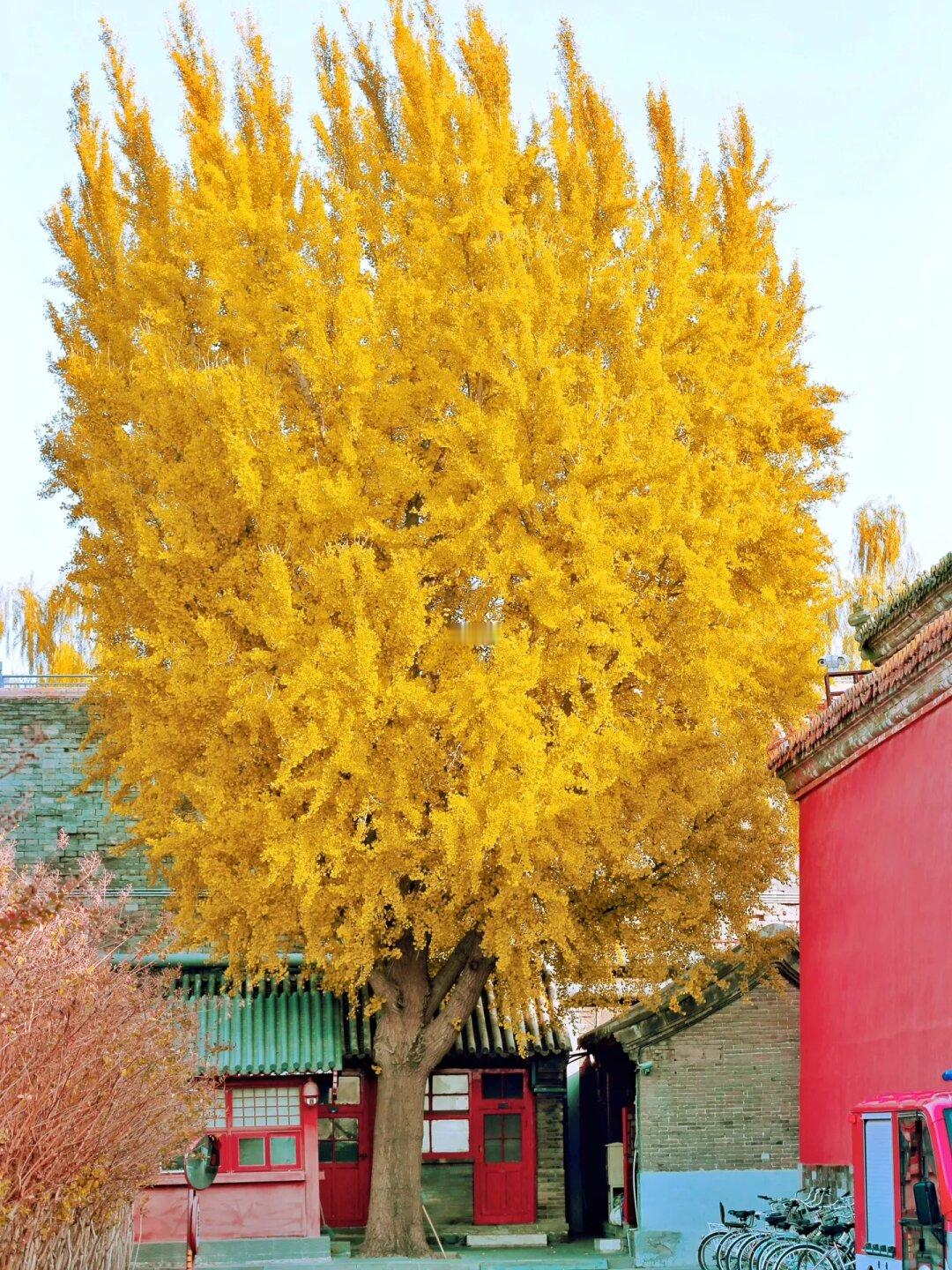 2、断虹桥也有20多株大银杏,映着红墙绿瓦,非常有质感
