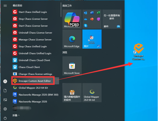 12、点击电脑桌面左下角开始按钮,找到刚刚安装的Enscape Custom Asset Editor软件,鼠标左键按住不动,拖到桌面。