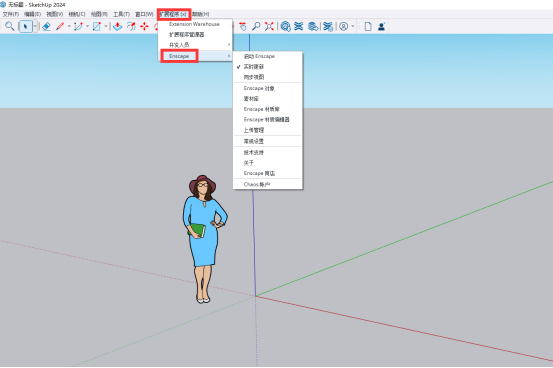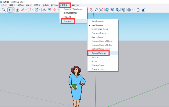 16、双击打开桌面的SketchUp 2024软件,点击【扩展程序】,即可看到【Enscape】选项,如果此时为英文的话,再点击【General Settings】。