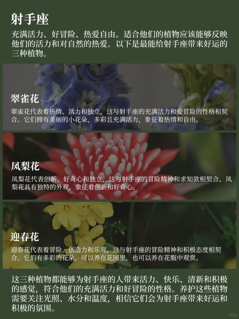 ♋巨蟹座:百合 滴水观音 水仙花 ♎天秤座:蔷薇花 蝴蝶兰 杜鹃花 ♉金牛座:吊兰 矮牵牛 银蕨 ♌狮子座:兰花 红玫瑰 麒麟草 ♑摩羯座:龟背竹 冰岛虞美人 玛格丽特菊 ♈白羊座:向日葵 红掌 仙人掌 ♒水瓶座:紫叶酢浆草 郁金香 蓝星草 ♐射手座:翠雀花 凤梨花 迎春花 ♍处女座:薰衣草 蓝雪花 多肉植物 ♓双鱼座:风信子 睡莲 马蹄莲 ♏天蝎座:鹤望兰 金边紫藤萝 黑竹 ♊双子座:蕙兰 薄荷 紫罗兰