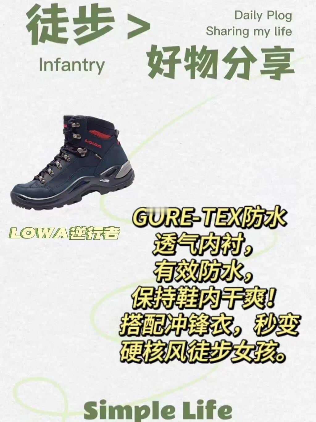一双轻量化又兼顾颜值的登山鞋总是能让徒步更轻松和舒适,侧面流畅的外骨架支撑性很好也很耐穿。和我的冲锋衣搭配一起,秒变硬核风徒步女孩,最主要就是它的防水性能一级棒!只要水没有没过脚踝 ,下大雨踩水完全不怕湿脚~
