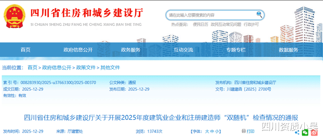今日,四川省住房和城乡建设厅发布了《关于开展2025年度建筑业企业和注册建造师“双随机”检查情况的通报》。