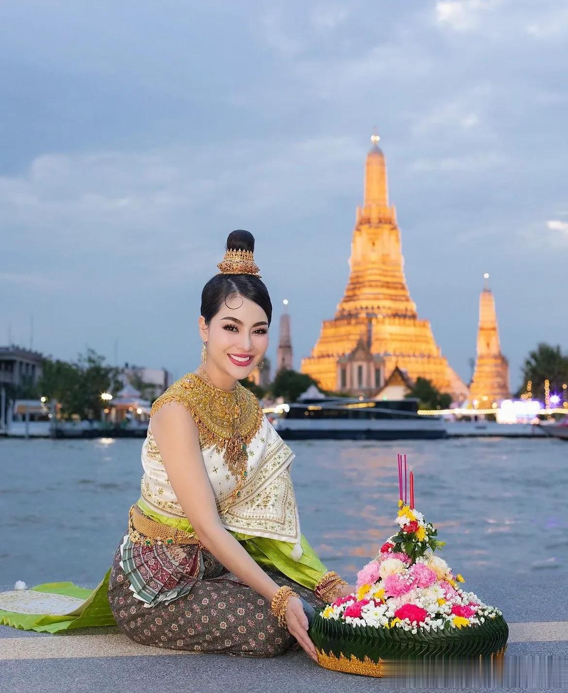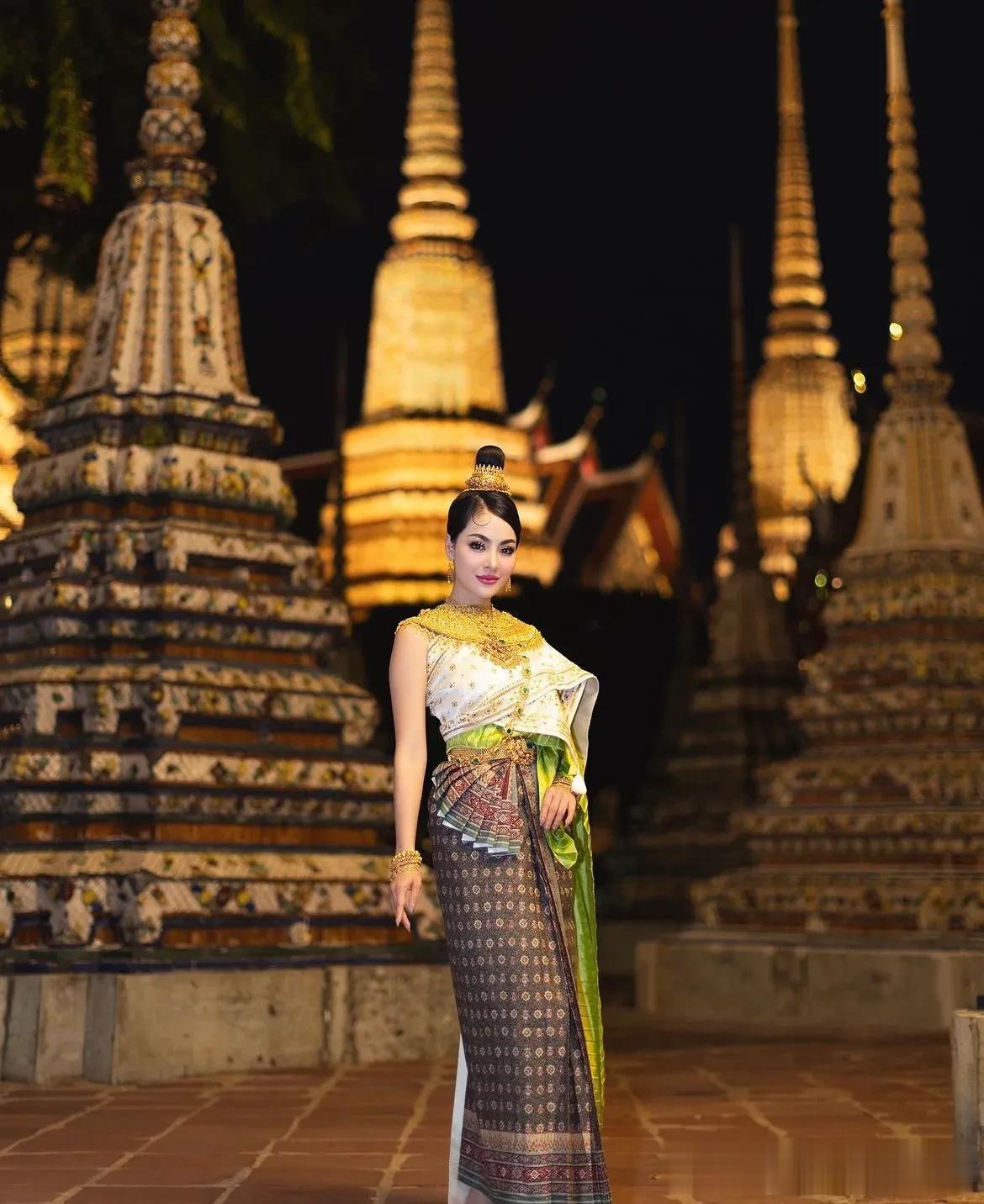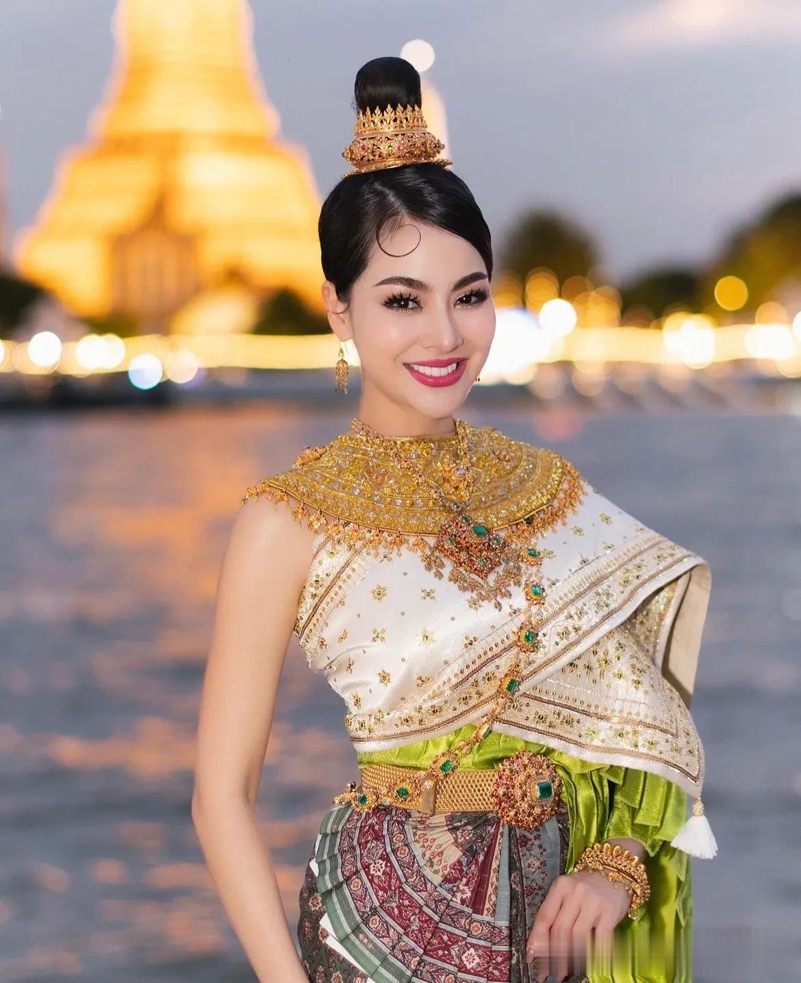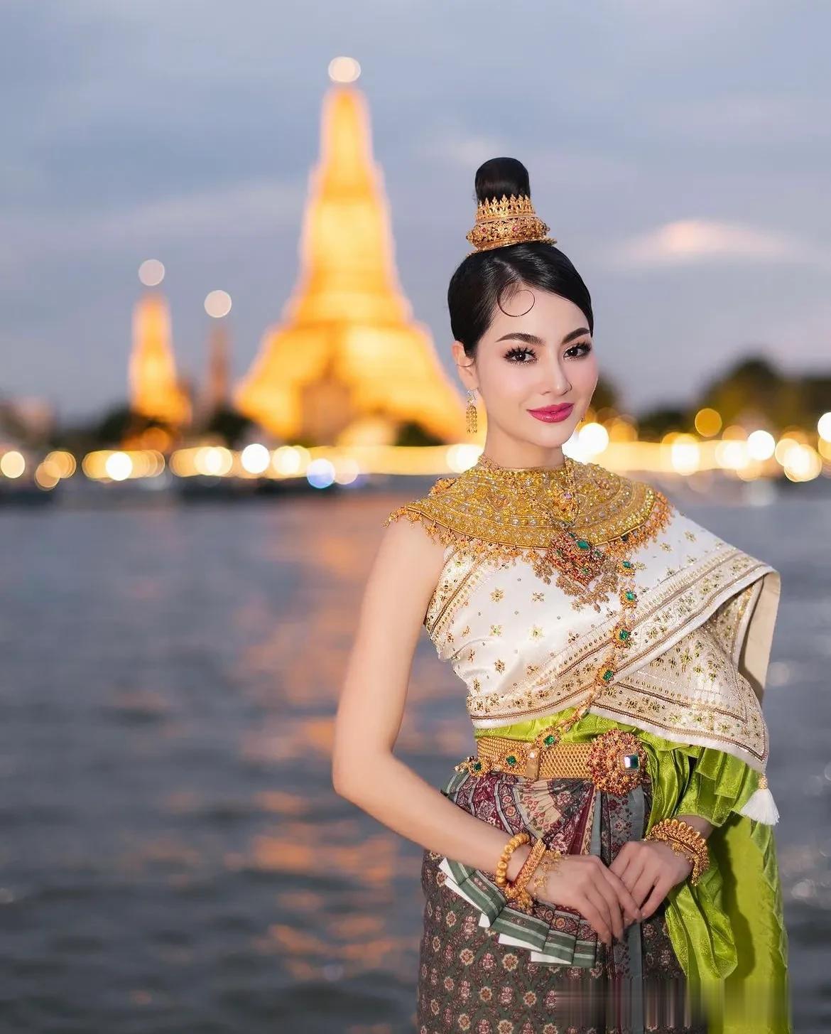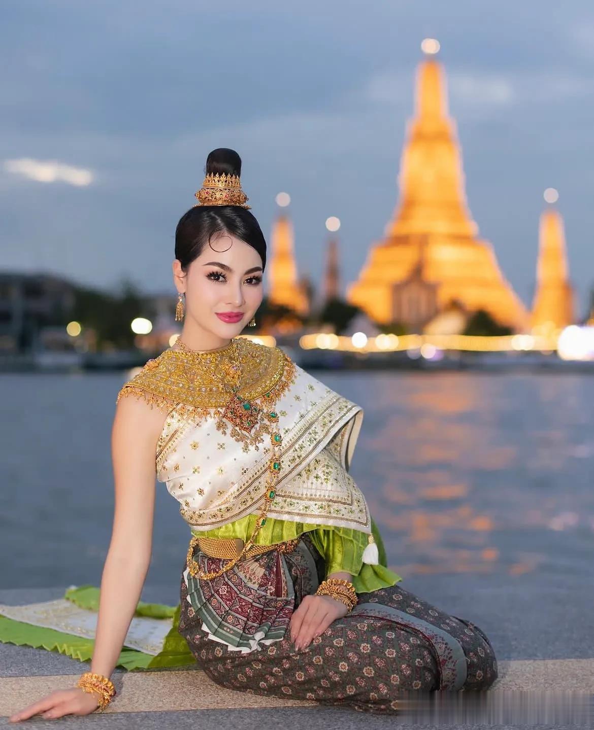 有大江大河穿城过的城市,向来都很美。曼谷也有大河穿越市区。在曼谷的河边,一位泰国女孩坐在人来人往的岸边拍照,入夜的曼谷河两岸,夜色挺美的。她的姿态宛如一幅生动的画卷,将泰国文化的优雅和热情展现得淋漓尽致。 她身着泰国的传统服饰,色彩鲜艳,极具特色。那华丽的公主裙,绿白相间,犹如翡翠镶嵌在白玉之中,既显清雅又不失高贵。那头冠,金光闪闪,上面垂下的珠宝,犹如夜空中璀璨的星辰,将她的面庞映照得更加娇美。 背景是大皇宫,那庄严壮观的建筑,见证了泰国的历史与文明。大皇宫的色彩与泰国女孩的服饰相映成趣,形成了一幅美丽的画面。在那里,历史的厚重与现代的活力交织在一起,仿佛在诉说着这个国家的独特韵味。