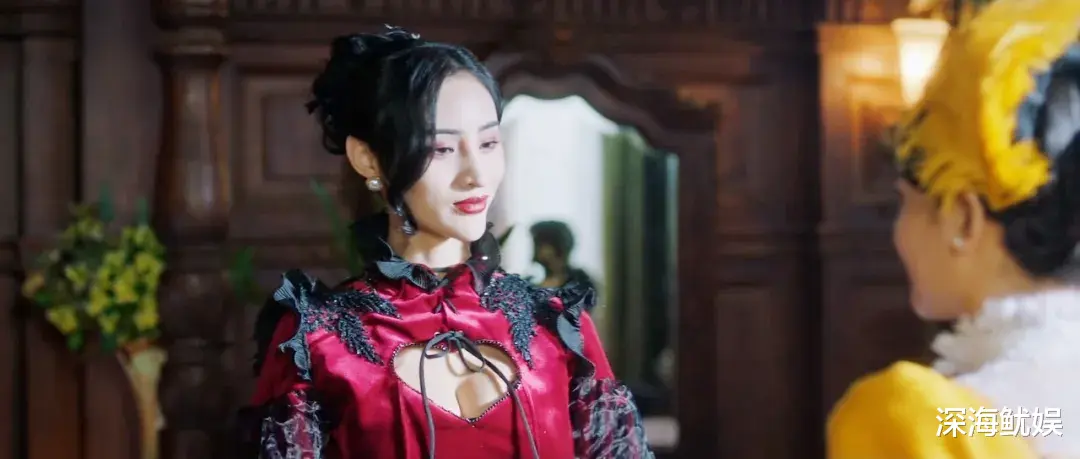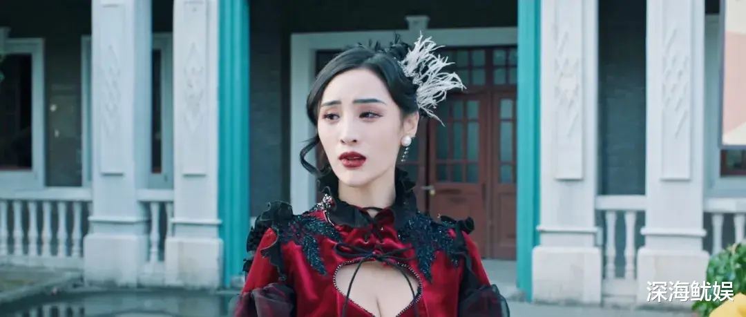 影片中,她穿着一身暗红色的裙装,这件衣服设计的很巧妙,胸前空了一块,一点也不避讳女演员的事业线。尤其是一些动作戏上,随着肢体摆动事业线更是清晰可见。