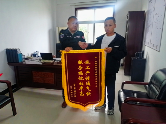 10月13日下午,华宴餐饮酒店经理殷国永专程来到信阳富地燃气明港分公司,送来一面写有“施工严谨通气快,服务热忱效率高”的锦旗,对公司在项目实施中展现的高效施工与优质服务表示高度赞誉。